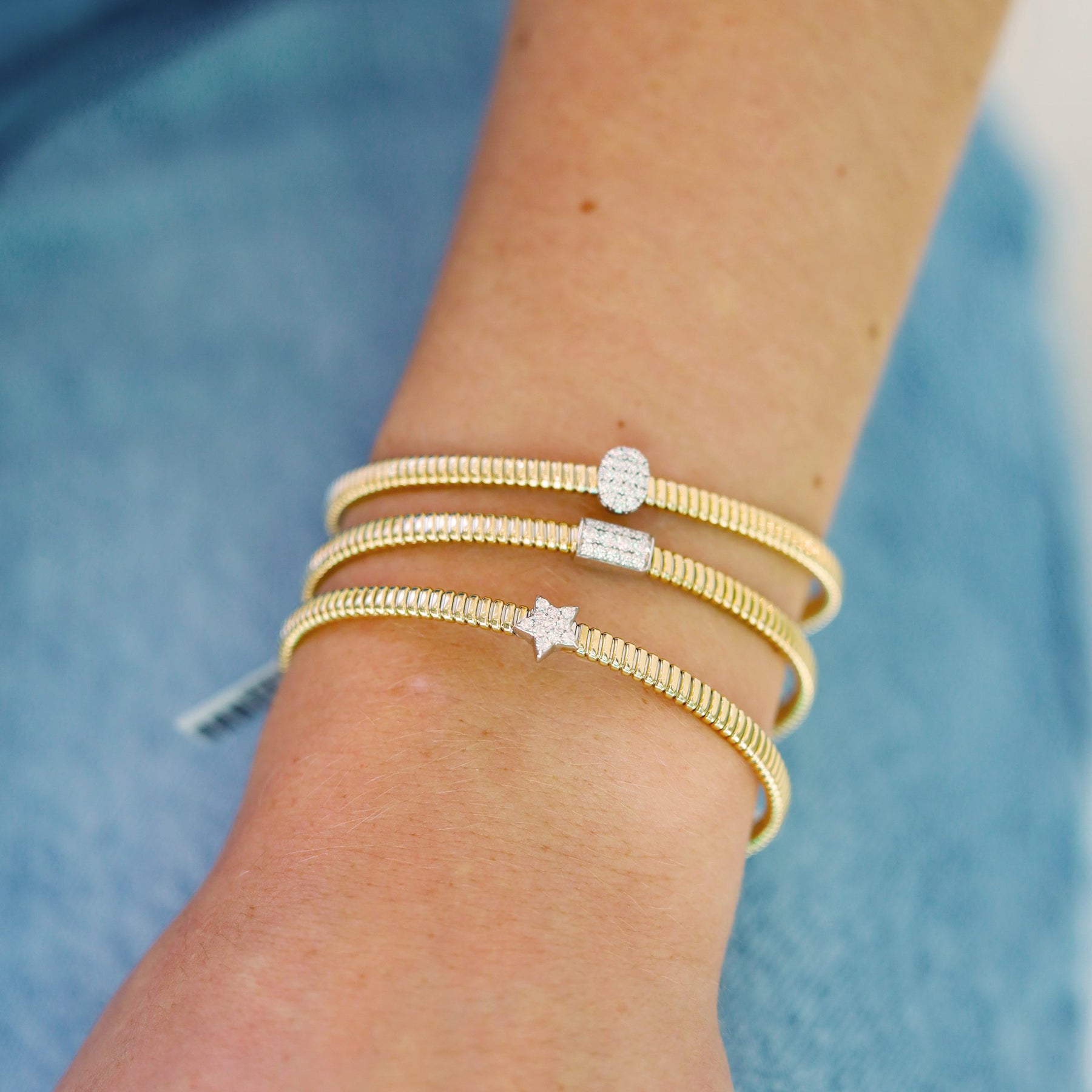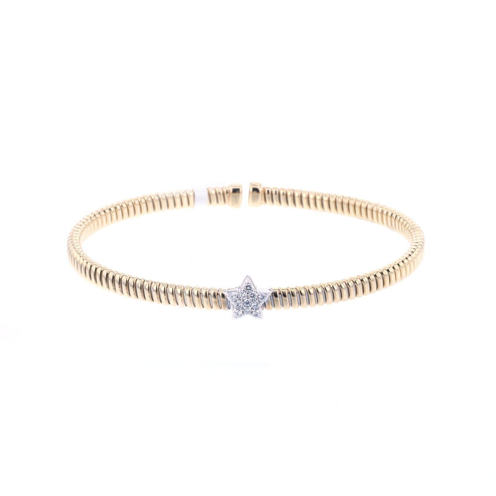 18KT yellow and white gold ribbed bangle featuring a pavé star design set with 11 round diamonds totaling 0.13ctw (GH color, VS2–SI1 clarity).