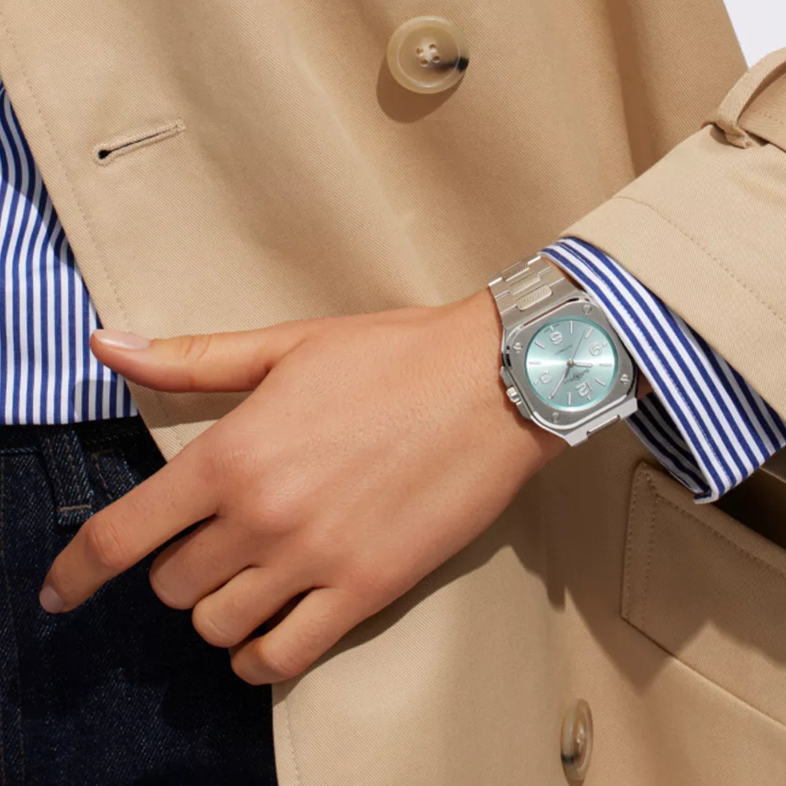 BR-05 Automatic 36mm watch with a stainless steel case, ice blue dial, and stainless steel bracelet with deployant clasp.