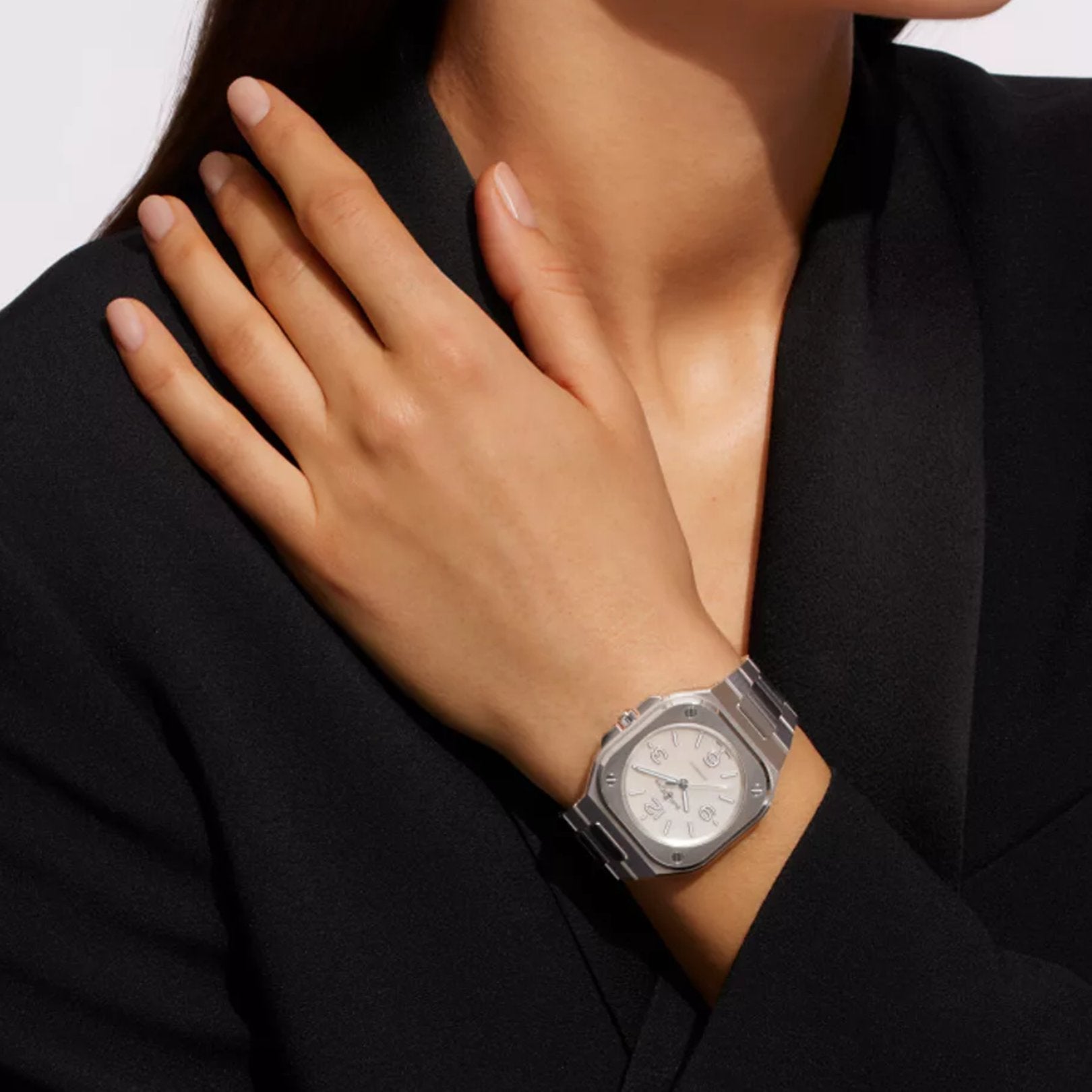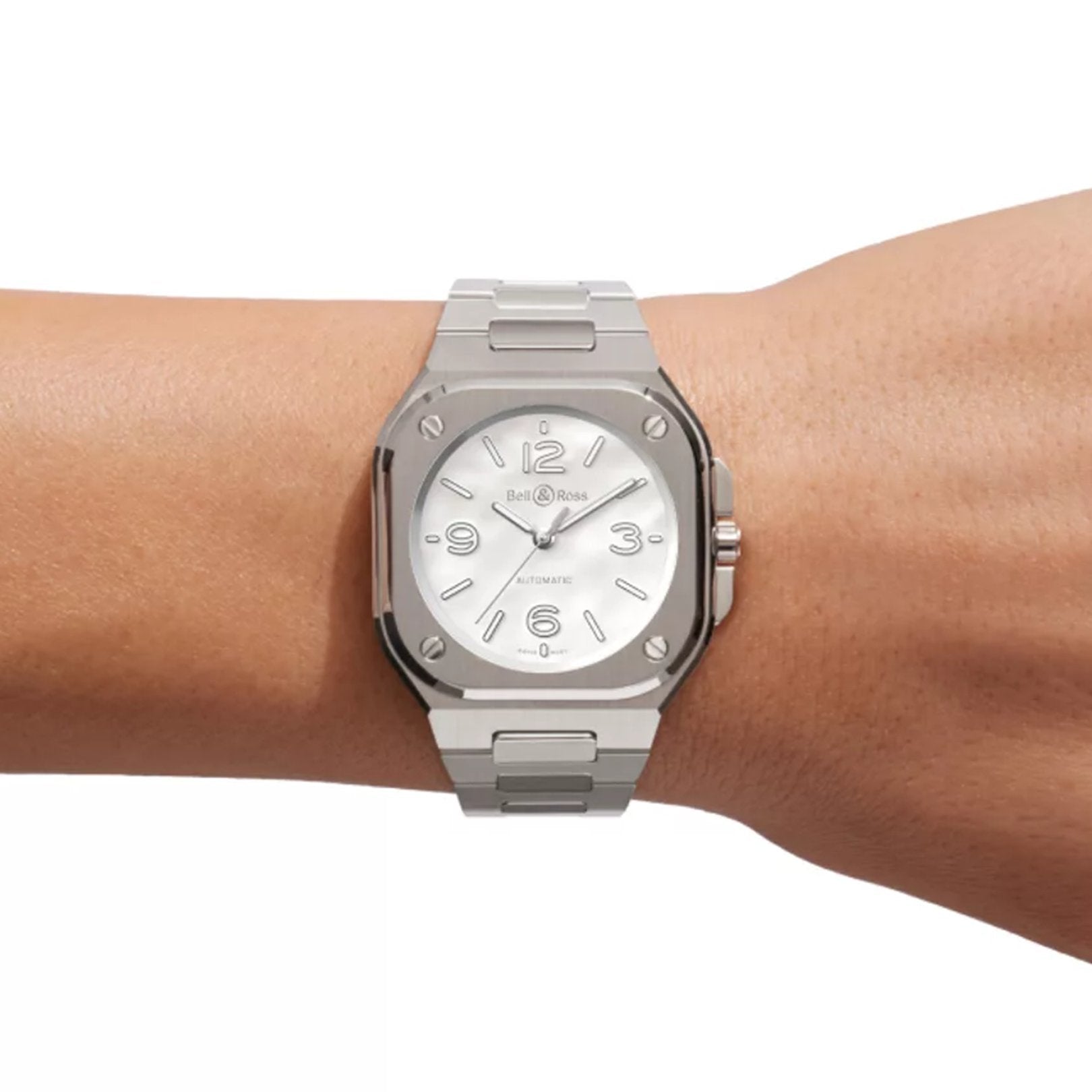 BR-05 Automatic 36mm watch with a stainless steel case, mother-of-pearl dial, and stainless steel bracelet with deployant clasp.