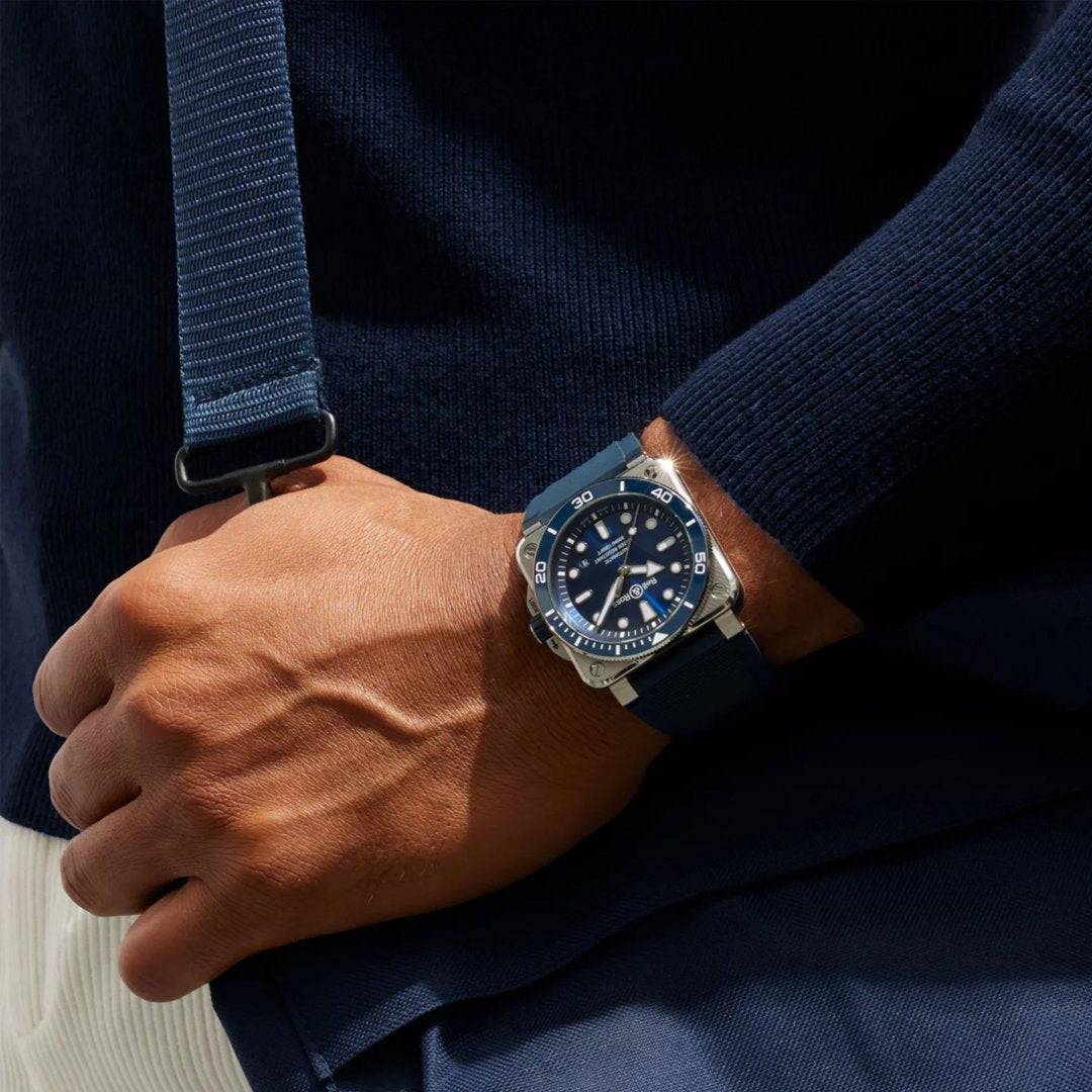 This BR-03 Diver Blue Steel automatic watch features a 42mm stainless steel case with a blue sunray dial, a blue rubber strap with a stainless steel tang buckle, and includes an additional black fabric strap with tools.