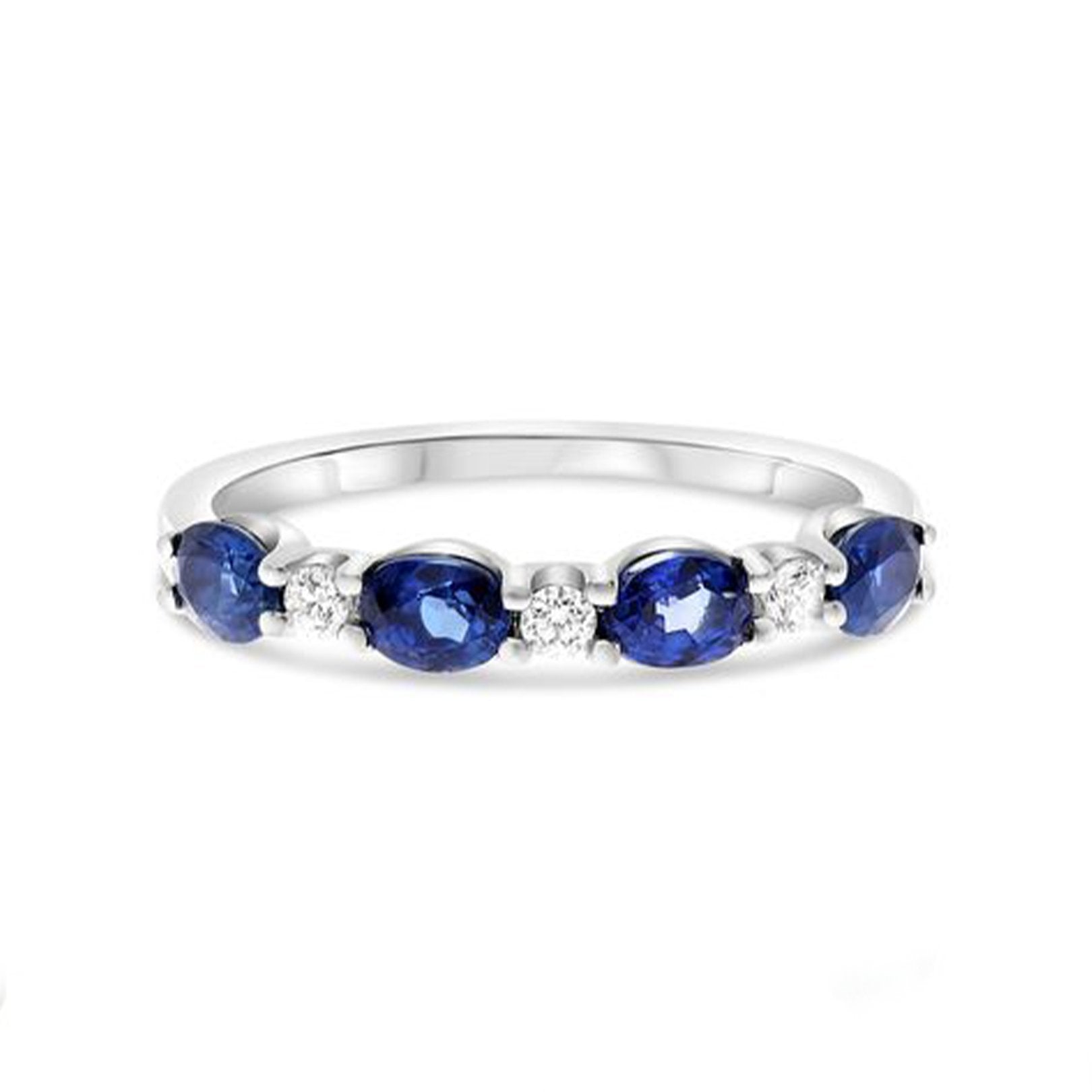 14K white gold band with 4 shared prong-set oval blue sapphires totaling 1.00 carat and 3 shared prong-set round diamonds totaling 0.09 carats.