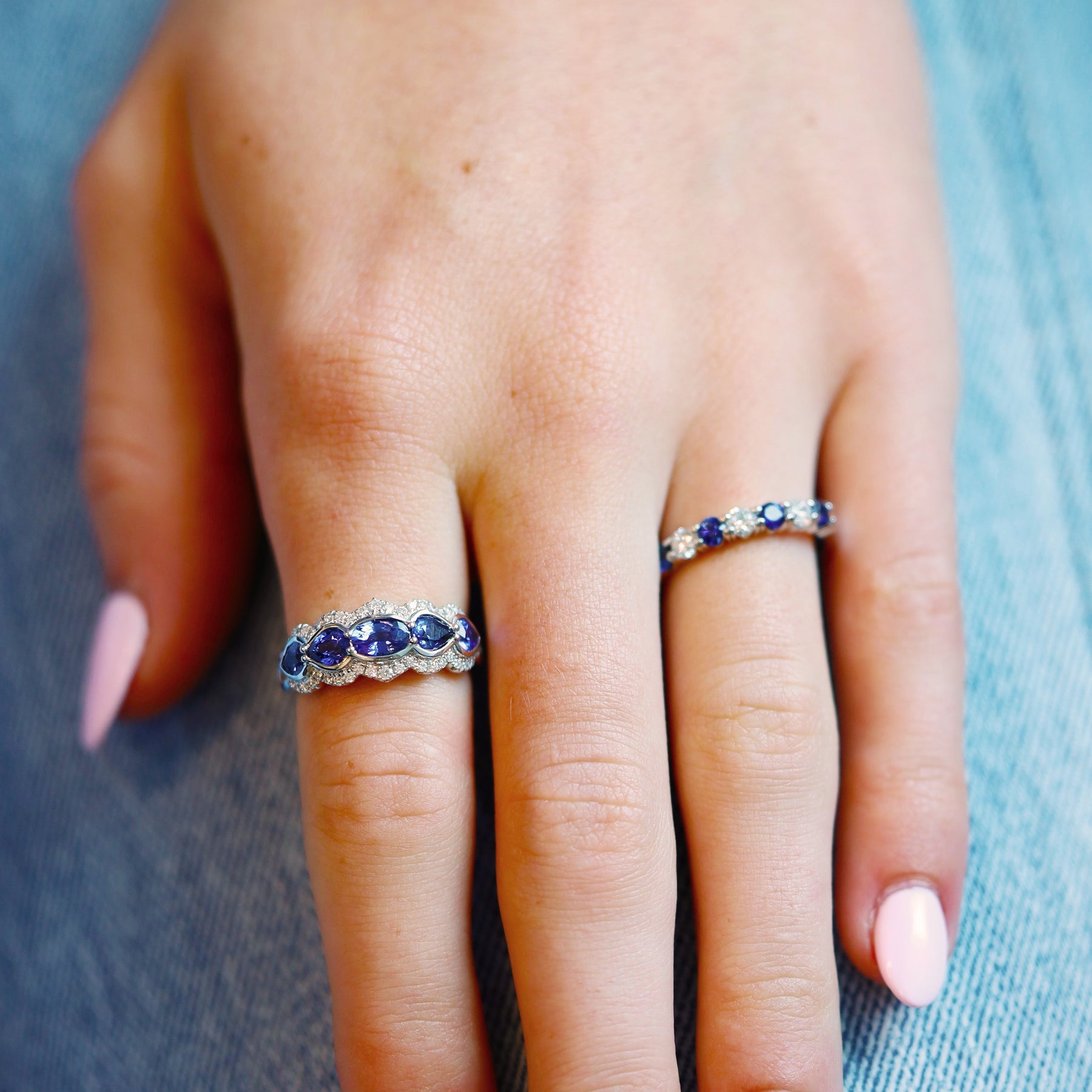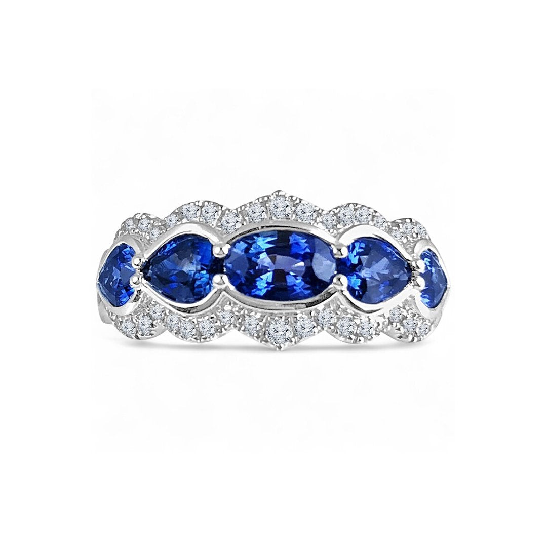 18K white gold ring featuring 5 bezel-set blue sapphires in pear and oval shapes (1.78ctw) and 48 prong-set round diamonds (0.29ctw, GH color, SI clarity).