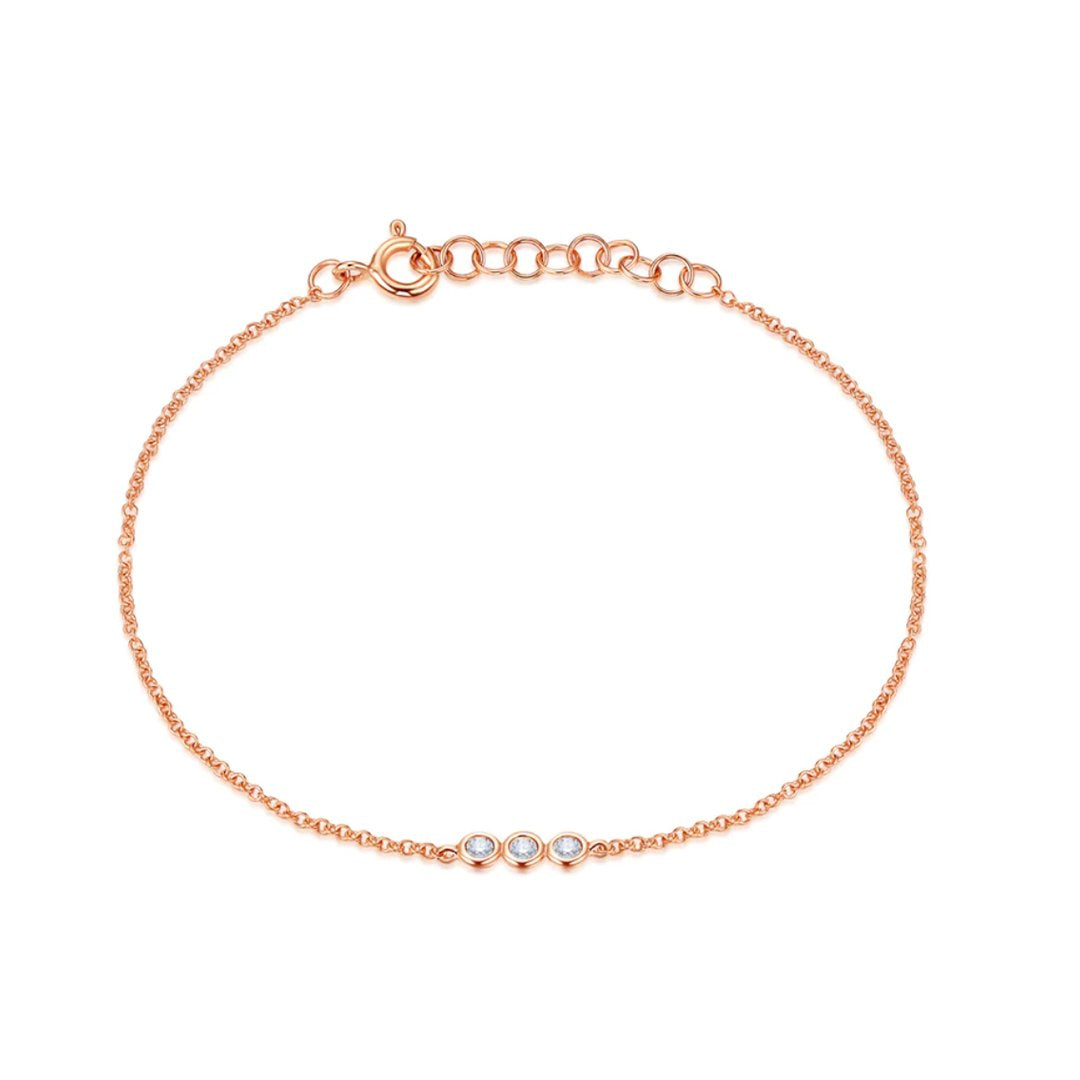 14K rose gold chain bracelet with 3 bezel-set round diamonds totaling 0.08ctw.