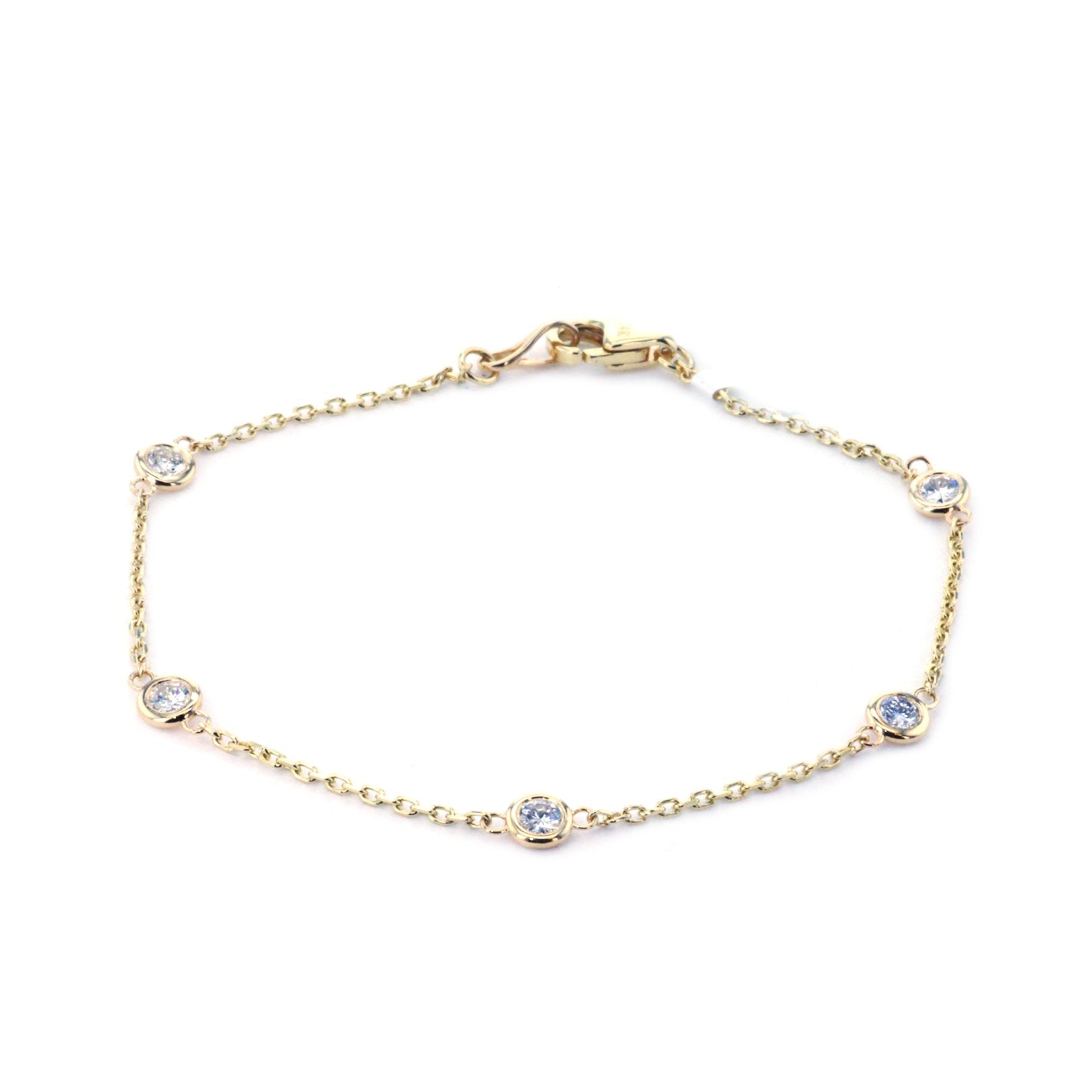 This bracelet is crafted in 14K yellow gold with a 7-inch length and a diamond-by-the-yard design. It features 5 round diamonds totaling 0.38 carats, each in a bezel setting. The diamonds are graded G–J color and SI–I1 clarity. This piece was custom created by Continental Diamond.
