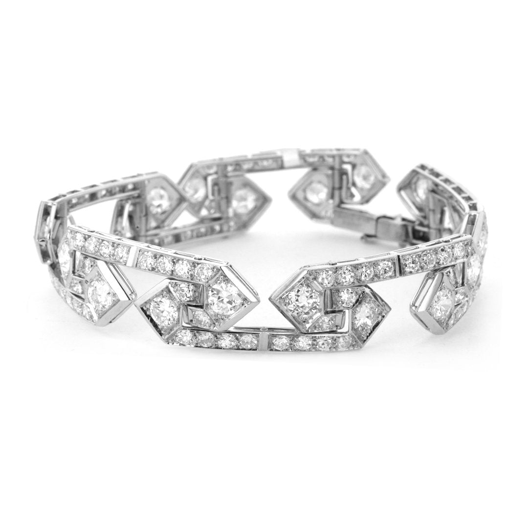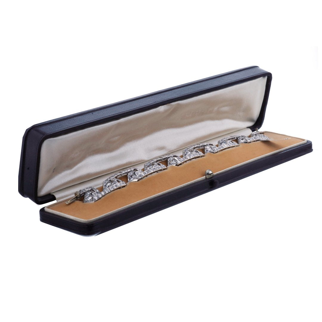 Estate platinum 7" Art Deco bracelet by La Cloche, Paris, set with 120 round diamonds totaling approximately 14.00ctw in a Greek key pattern. Includes fitted box. Circa 1935.