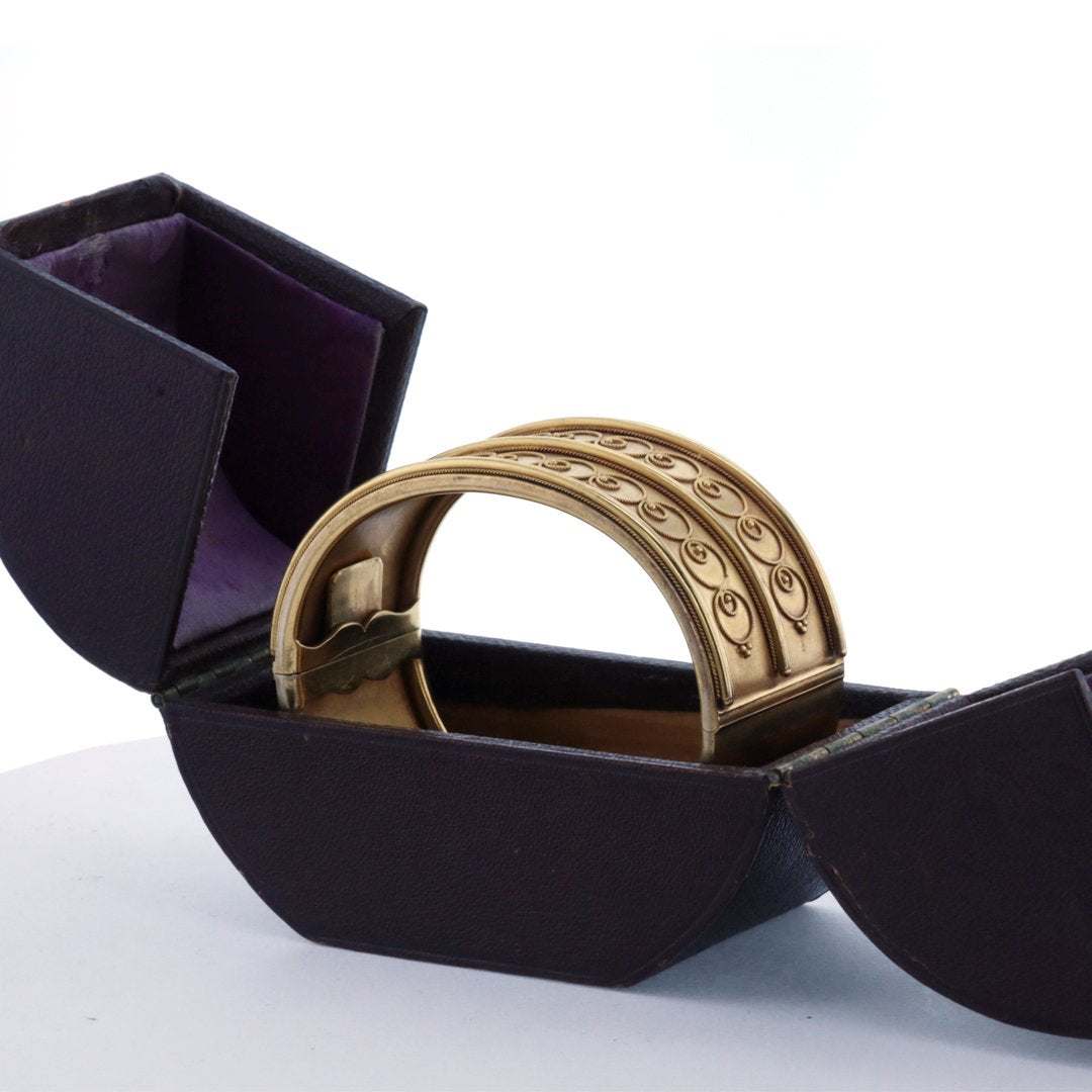 Estate 18K yellow gold Etruscan Revival hinged bangle with a beautiful patina. Includes fitted box. Circa 1880.