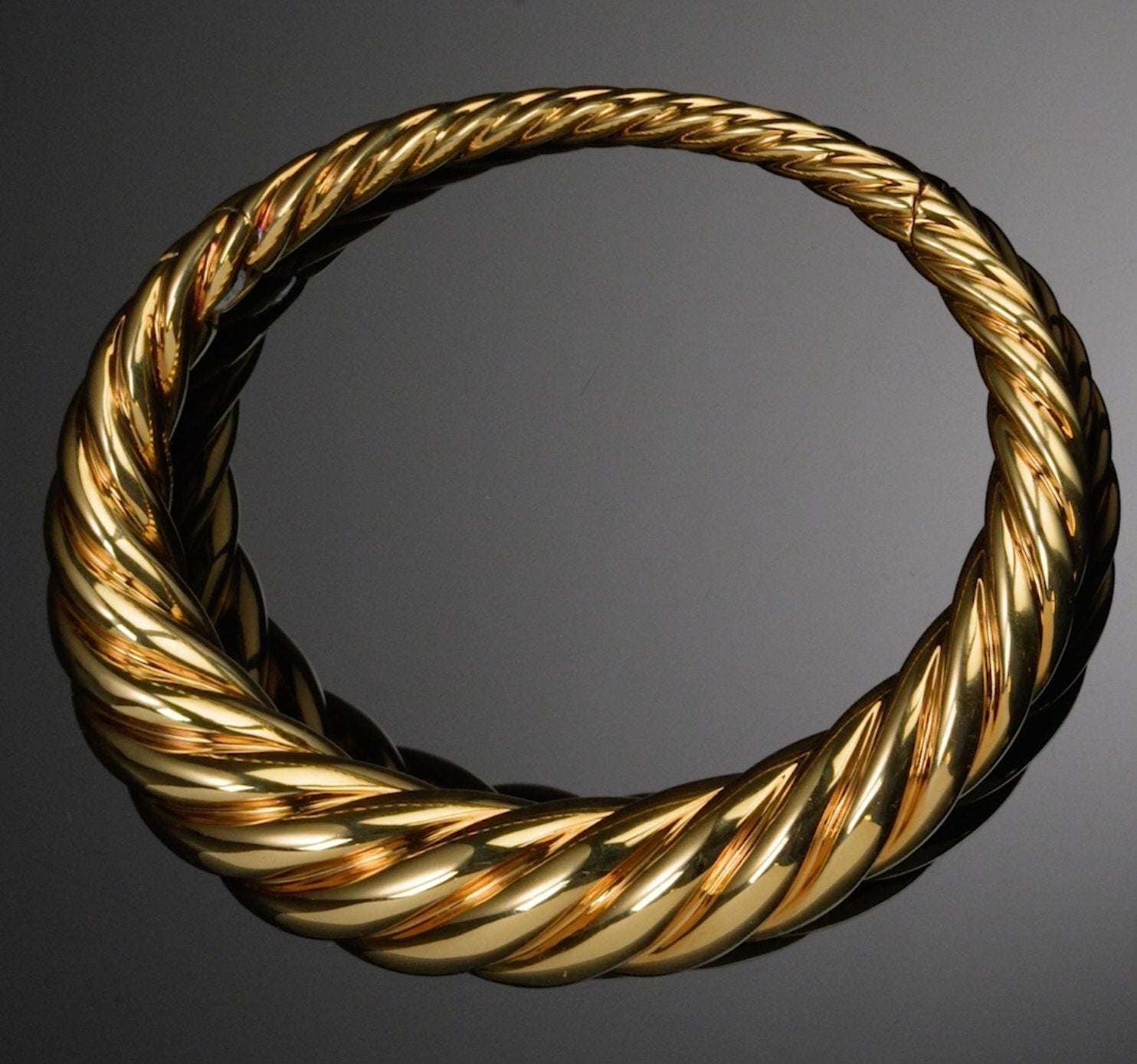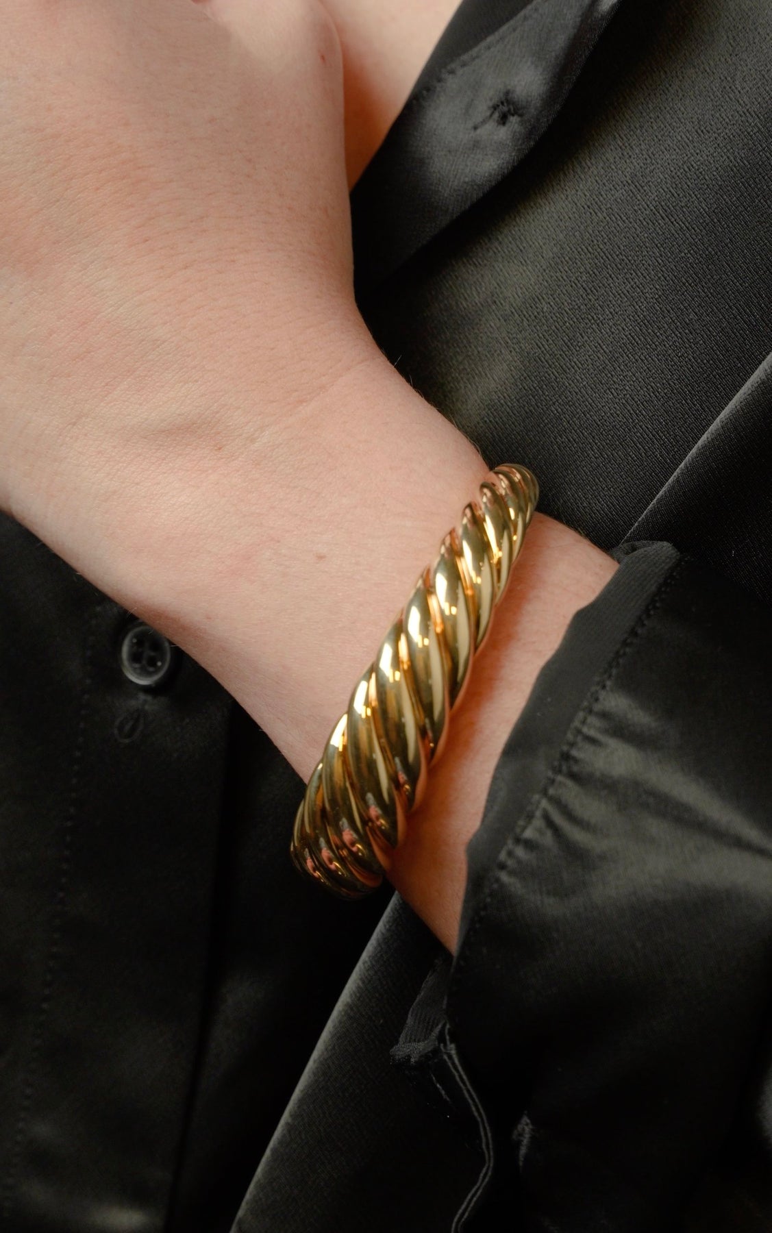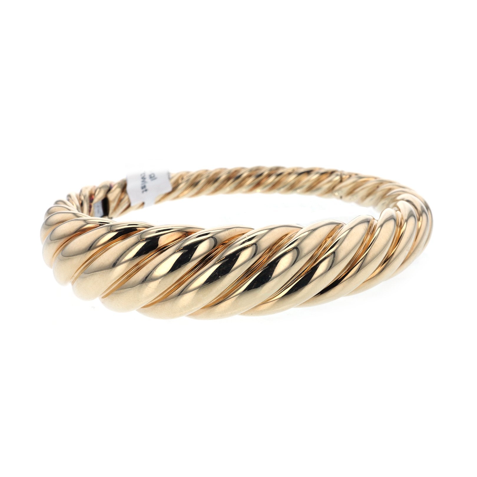 Estate 18K yellow gold David Yurman Pure Form twisted cable bangle measuring approximately 17mm, featuring a tapered top and kick hinge. Marked “D.Y. 750.”