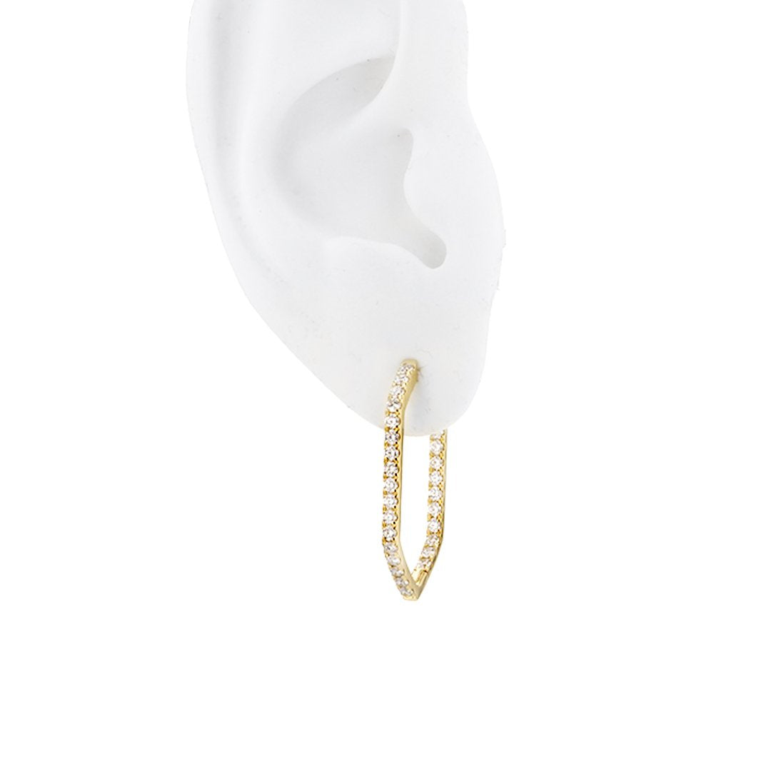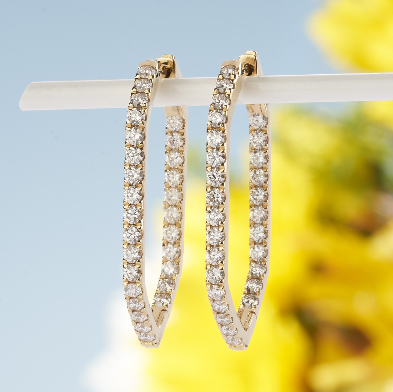 These hoop earrings are crafted in 18K yellow gold with diamonds set both inside and outside the design. They feature 56 round diamonds totaling 1.95 carats in four-prong settings. The diamonds are graded G color and SI1 clarity.