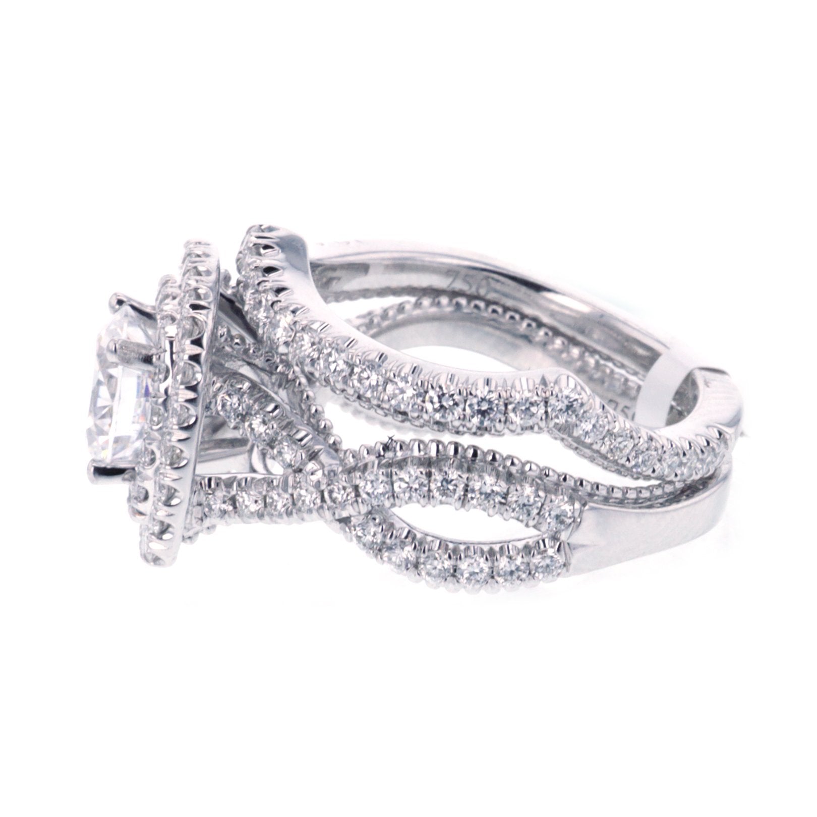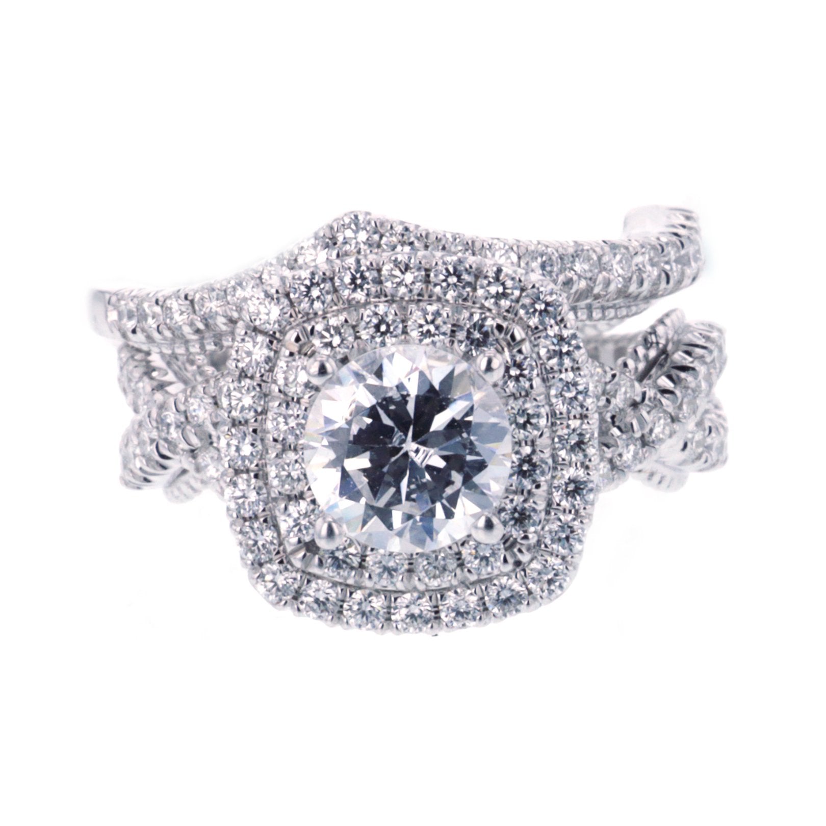 This 18K white gold two-ring set features a two-row halo semi-mount with a four-prong setting designed for a 1.00ct round center and a milgrain shank. The matching band is set with 0.28ctw prong-set round diamonds, while the semi-mount features 0.98ctw prong-set round diamonds (GH/VS–SI). Center sold separately. Available by special order in other metals, shapes, and sizes.