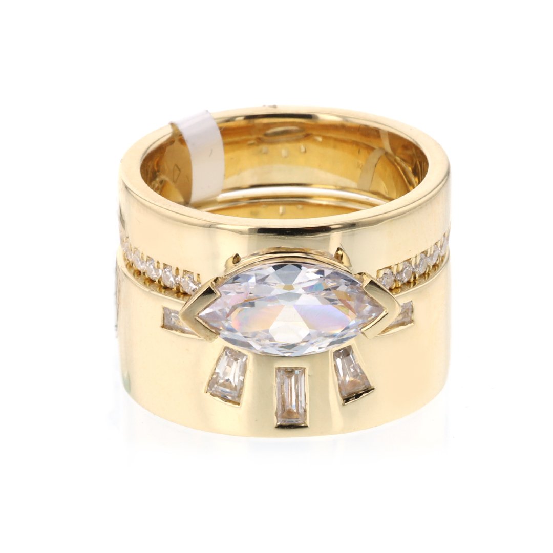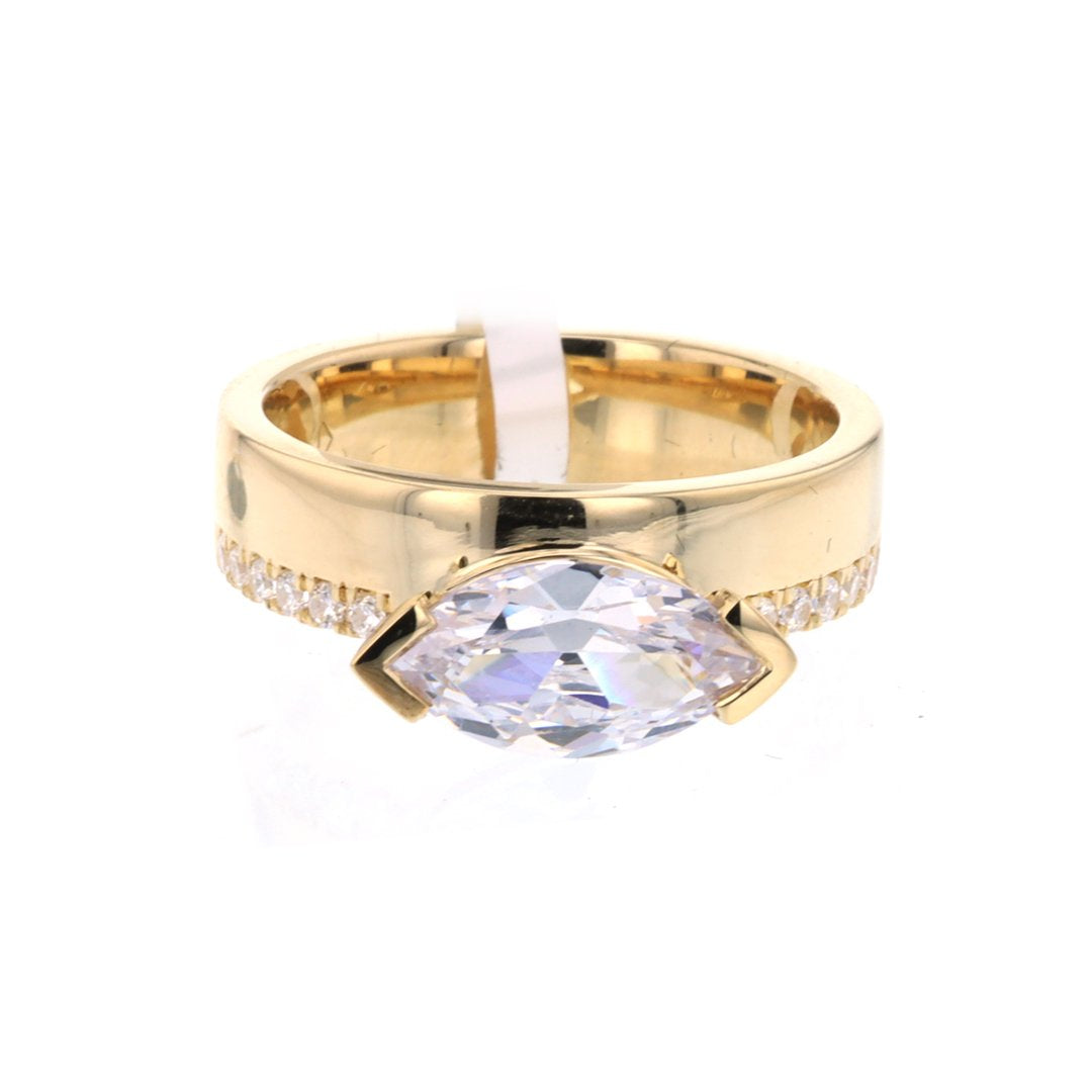 This semi-mount ring is crafted in 14K yellow gold with a two “V” prong setting designed to hold a 1.50 carat marquise crown size. The band is accented with 12 round diamonds totaling 0.15 carats in prong settings. The in-store ring is a sample and available by special order only. Other metal colors, types, diamond shapes, and sizes can also be ordered. Center sold separately. Shown with matching band (M10282105), sold separately.