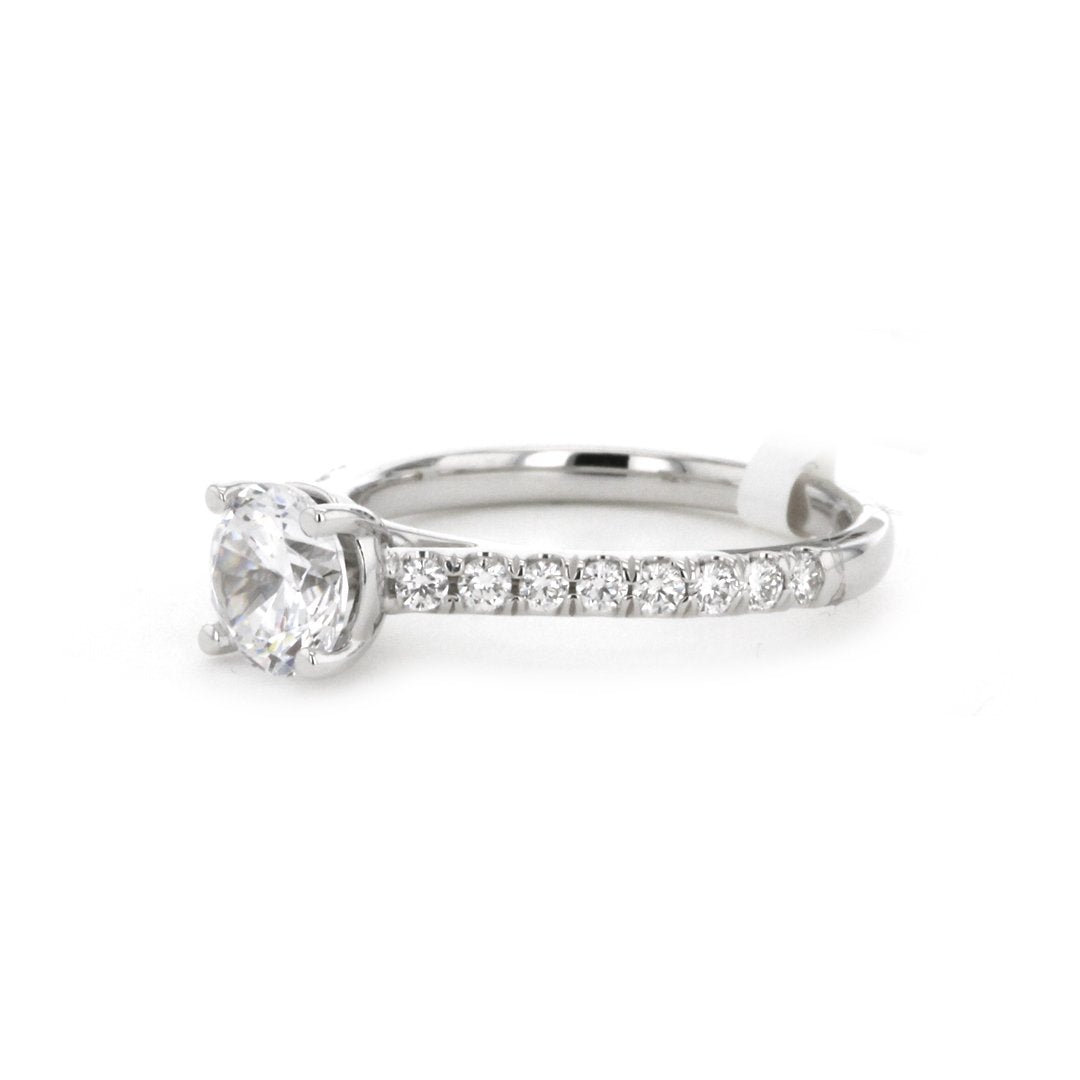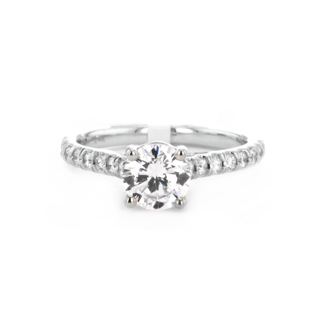 14kt white gold 4-prong cathedral semi-mount ring with a 1.00ct round crown-size, featuring 16 prong-set round diamonds totaling 0.32ctw (FG/VS). From the Signature Collection by Continental Diamond. Center sold separately. Available by special order in other metals, shapes, and sizes.