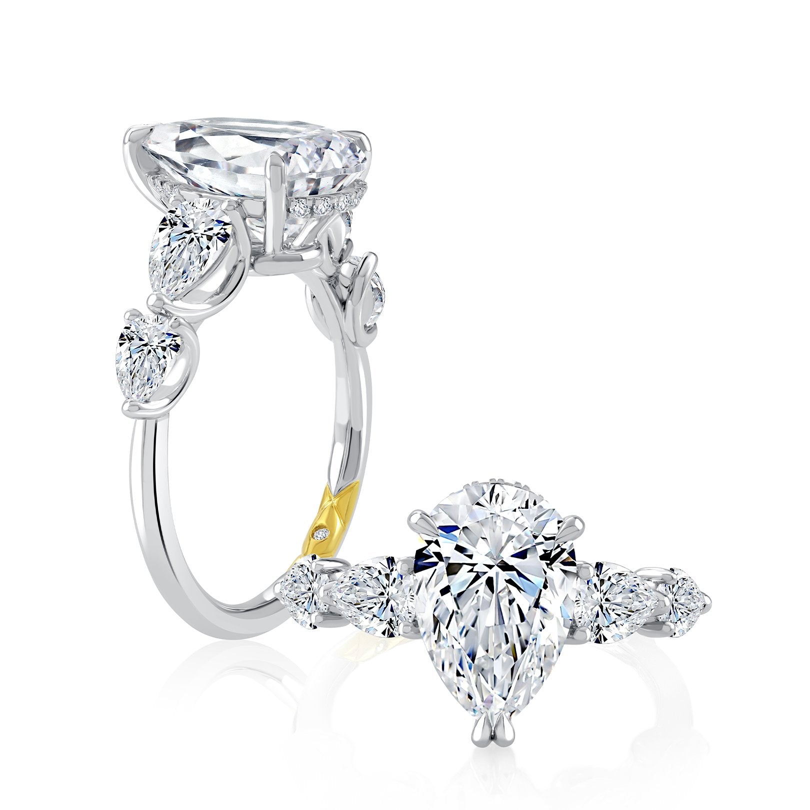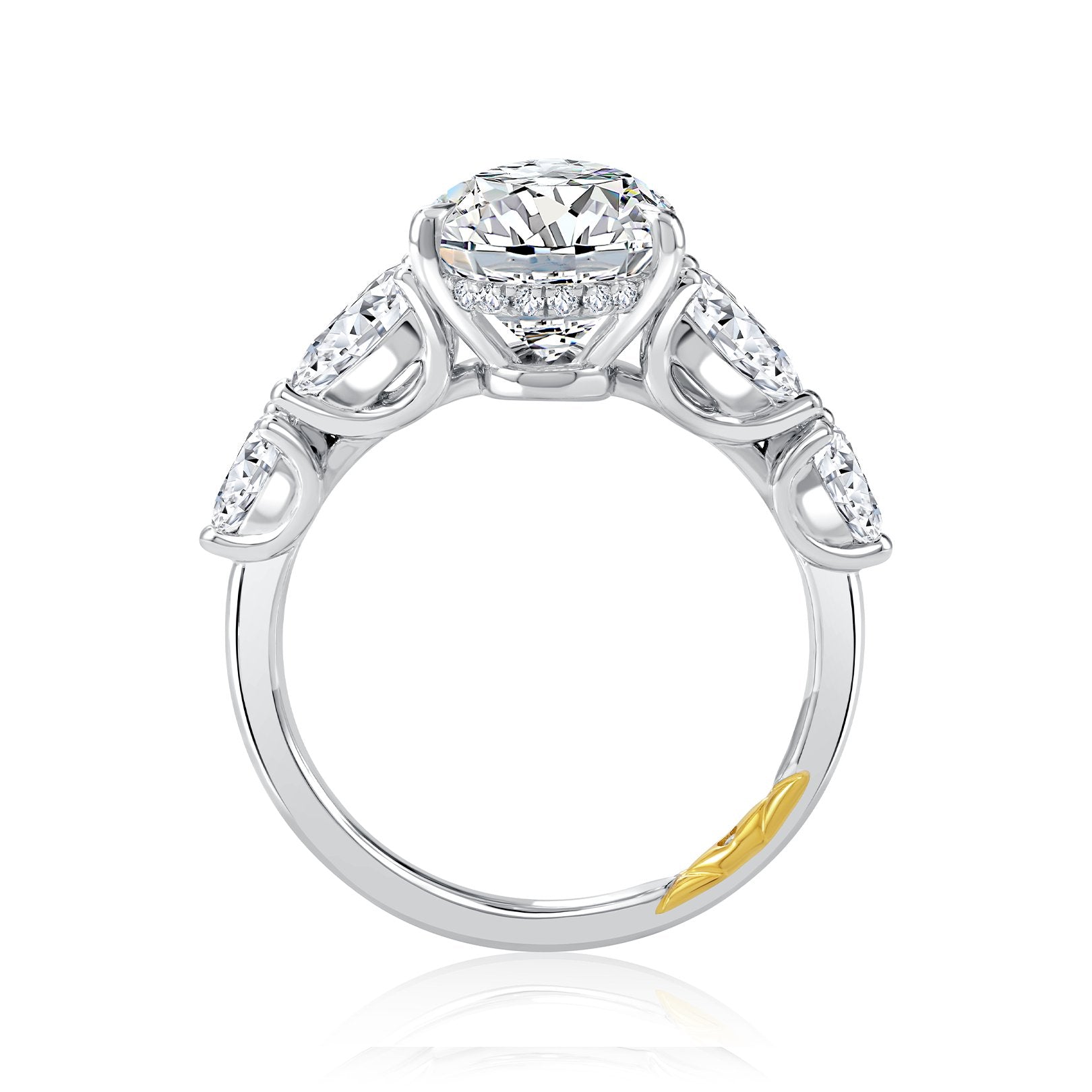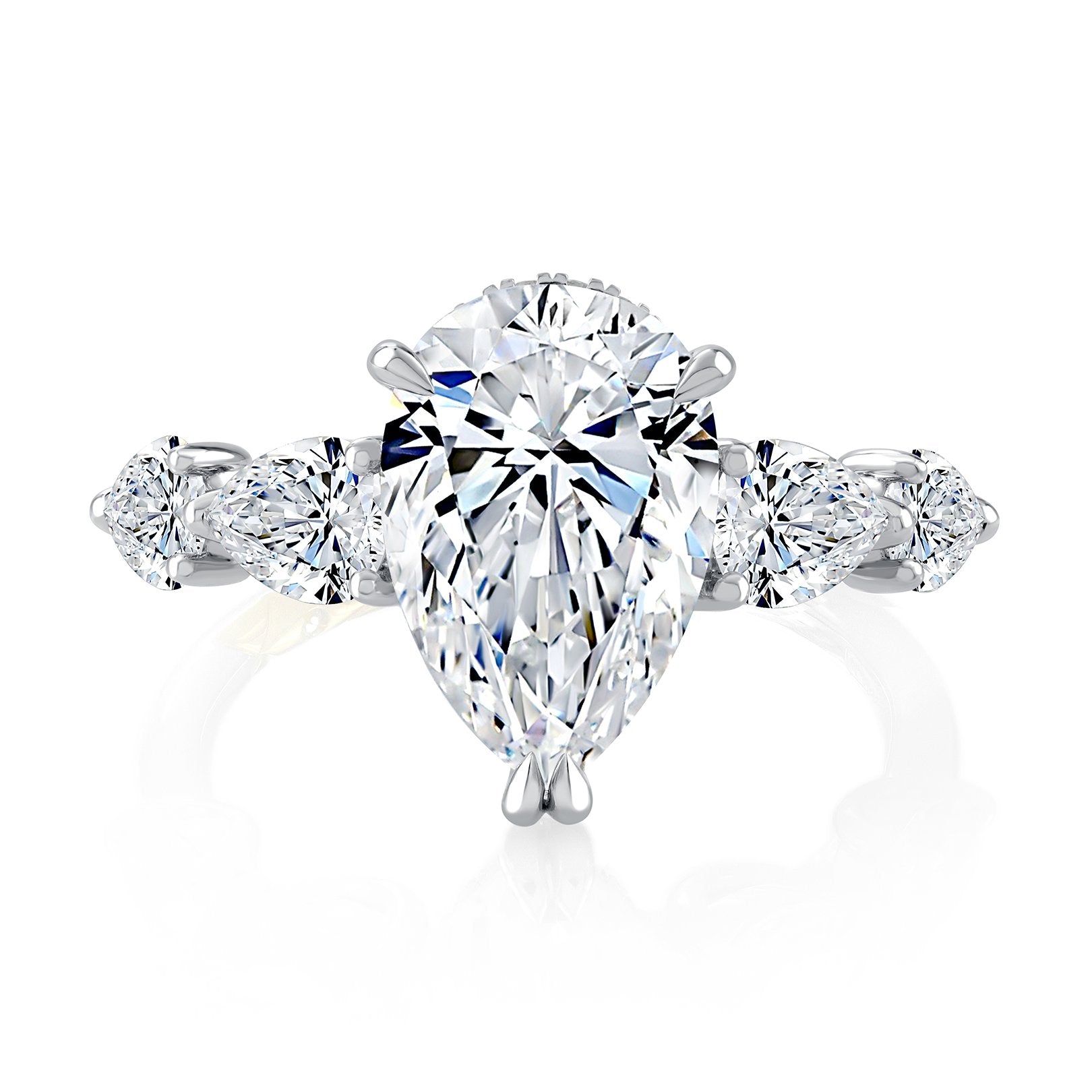 14K white gold hidden halo semi-mount ring with a four-prong setting for a 3.00 carat pear-shaped center. Accented with 16 pear and round diamonds totaling 1.02 carats, prong set, G color and SI clarity, plus one hidden diamond in the shank totaling 0.004 carats. Center sold separately. Available by special order in other metals, shapes, and sizes.