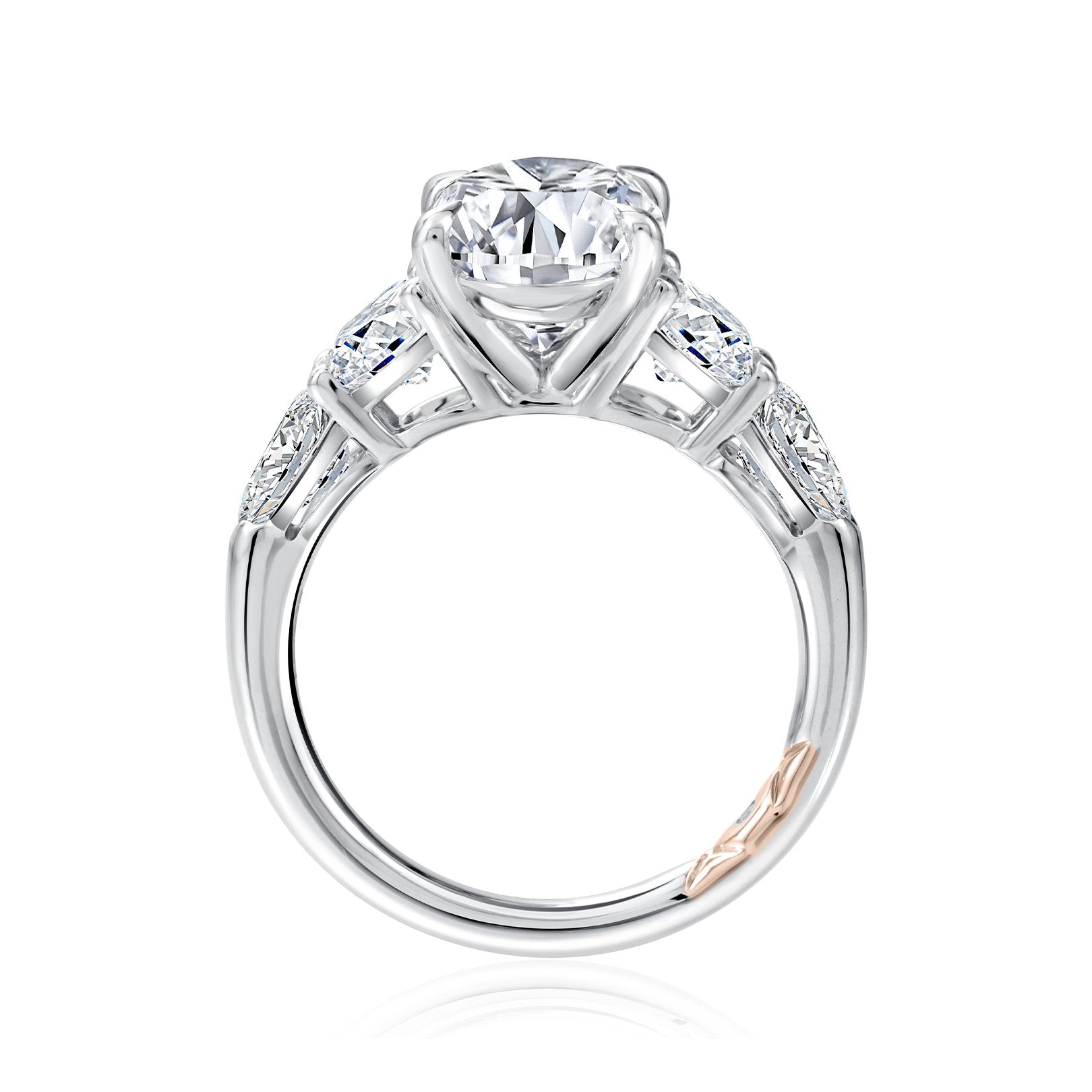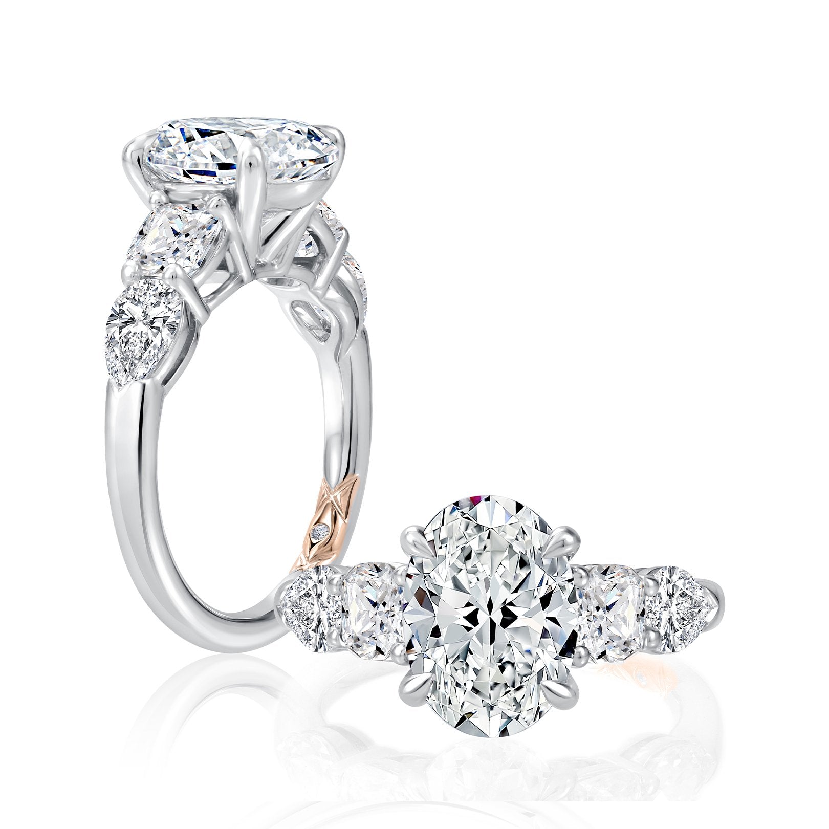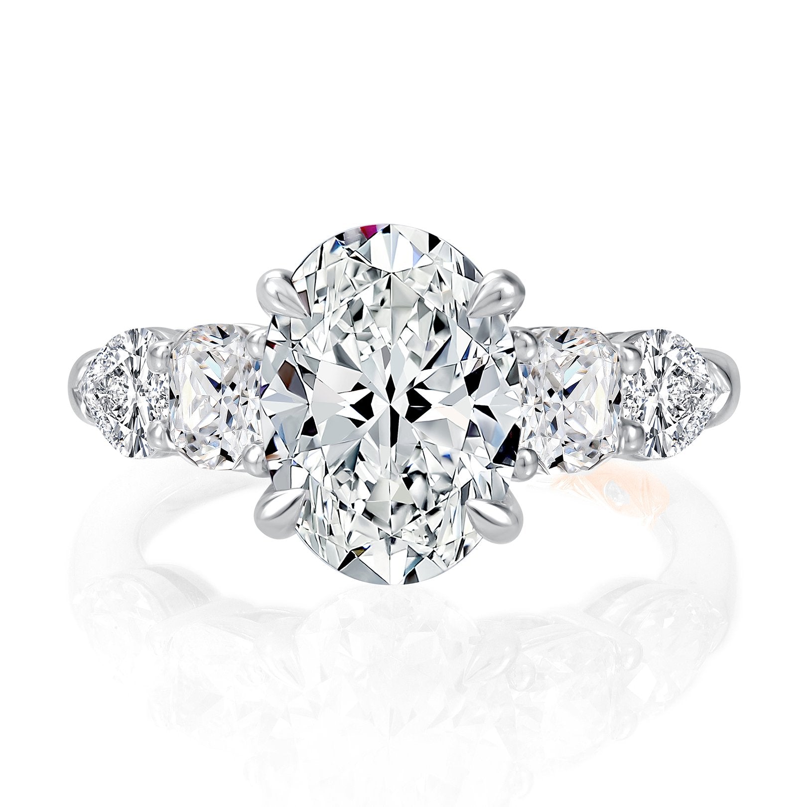 14K white gold semi-mount ring with a four-prong setting for a 3.00 carat oval center. Accented with 4 cushion and pear-shaped diamonds totaling 1.66 carats, shared prong set, G color and SI clarity, plus one hidden diamond in the shank totaling 0.004 carats. Center sold separately. Available by special order in other metals, shapes, and sizes.