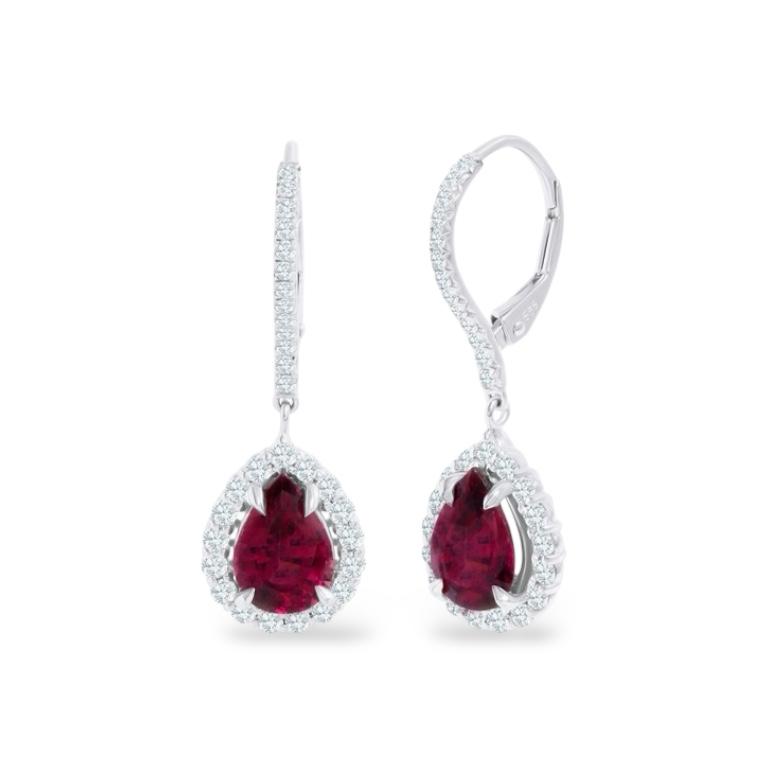 14K white gold pear halo leverback earrings featuring 2 pear-shaped raspberry garnets (3.39ctw) in 4-prong settings, surrounded by 60 prong-set round diamonds (0.79ctw, GH color, SI clarity).