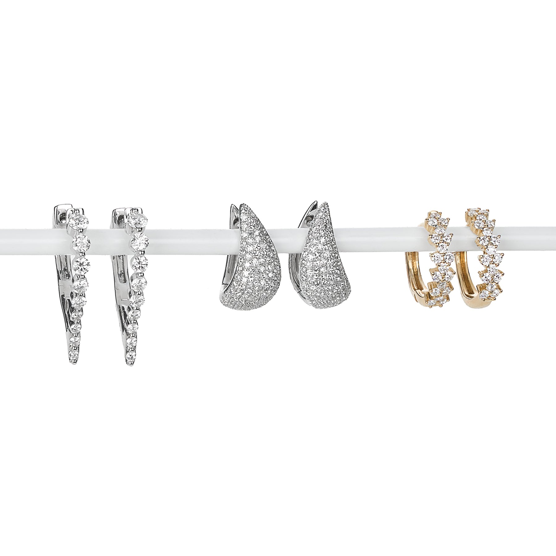 14kt white gold “V” hoop earrings with 18 single prong-set round diamonds totaling 0.50ctw.