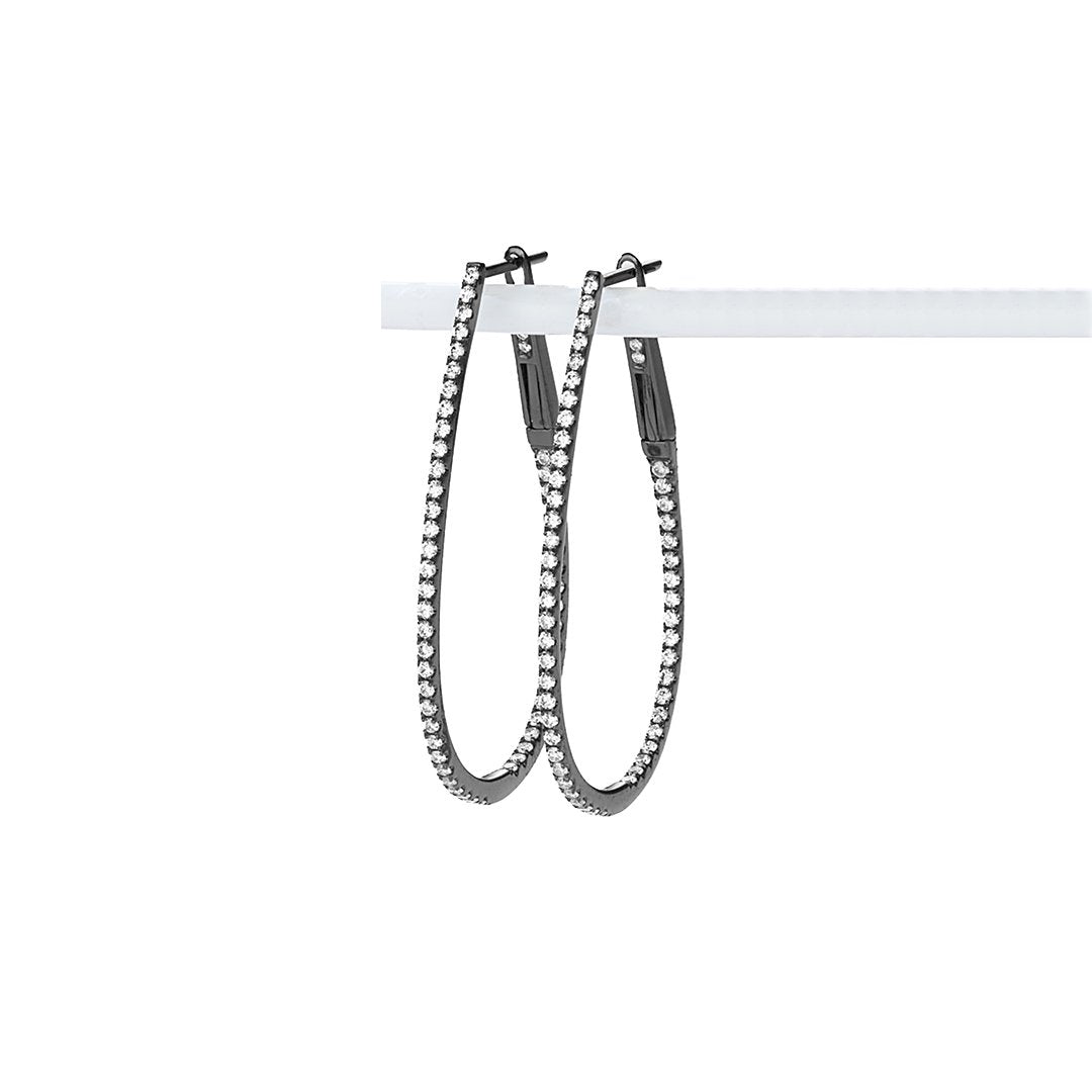 18K white gold 1.50" pear-shaped hoop earrings with black rhodium finish. Set with 106 round diamonds totaling 0.70 carats. Diamonds are 4-prong set inside and outside the hoops, GH color, SI2 clarity.