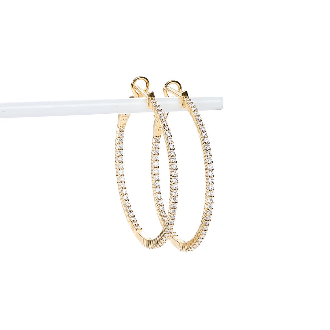 14K yellow gold 1.20-inch inside-outside hoop earrings with 104 round diamonds totaling 1.02 carats, shared prong set. Diamonds are GH color and VS-SI clarity.