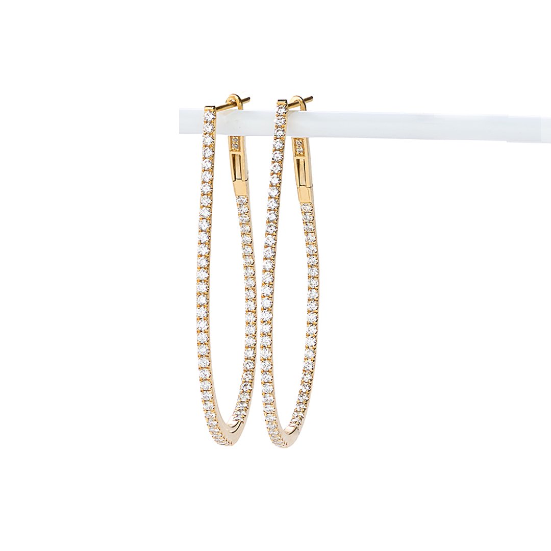 18K yellow gold 1.75" pear-shaped hoop earrings with 114 prong-set round diamonds totaling 1.21 carats. Diamonds are set inside and outside the hoops, GH color, SI2 clarity.