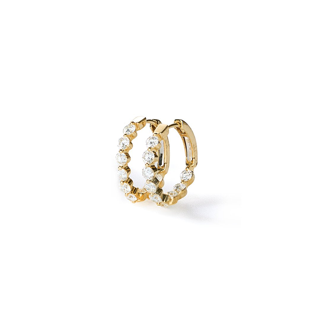14KT yellow gold ¾" round hoop earrings showcasing 18 round diamonds totaling 1.50 carats, set inside and out in a shared single prong style. Diamonds are GH color and VS-SI clarity.