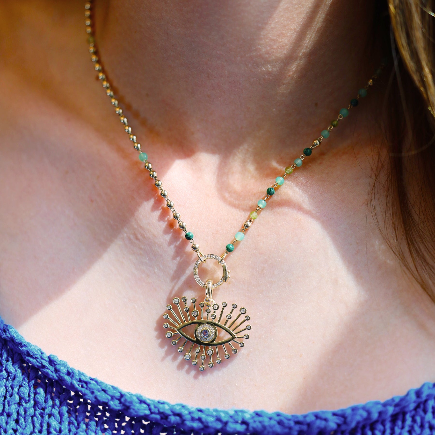 14K yellow gold 18" beaded bubble necklace with chrysoprase, malachite, and peridot, finished with a round diamond clasp. Pendants sold separately.