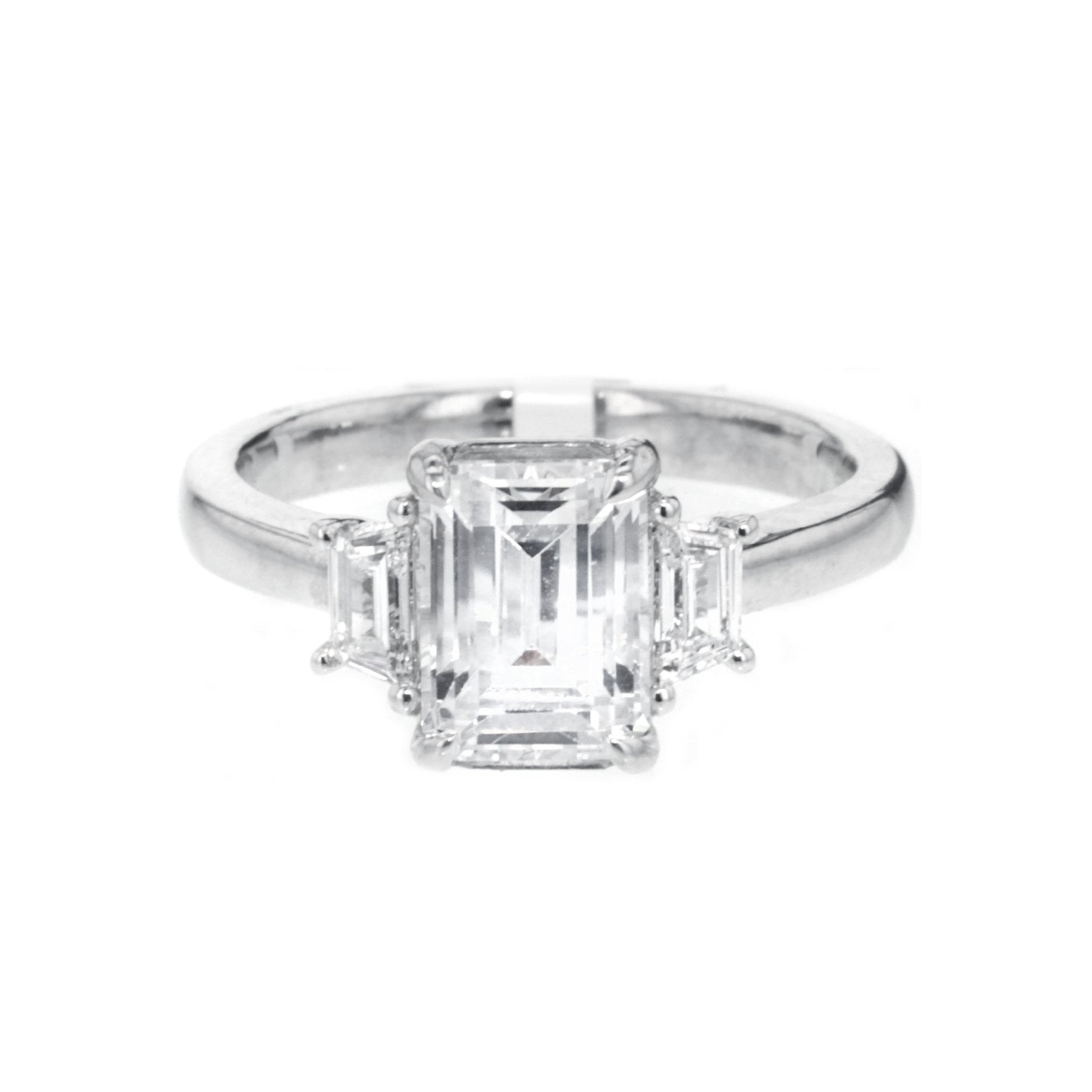 Platinum semi-mount ring with a four-prong setting for a 2.50 carat emerald-cut center. Accented with 2 trapezoid diamonds totaling 0.33 carats, four-prong set, GH color and SI clarity. Center sold separately. Available by special order in other metals, shapes, and sizes.