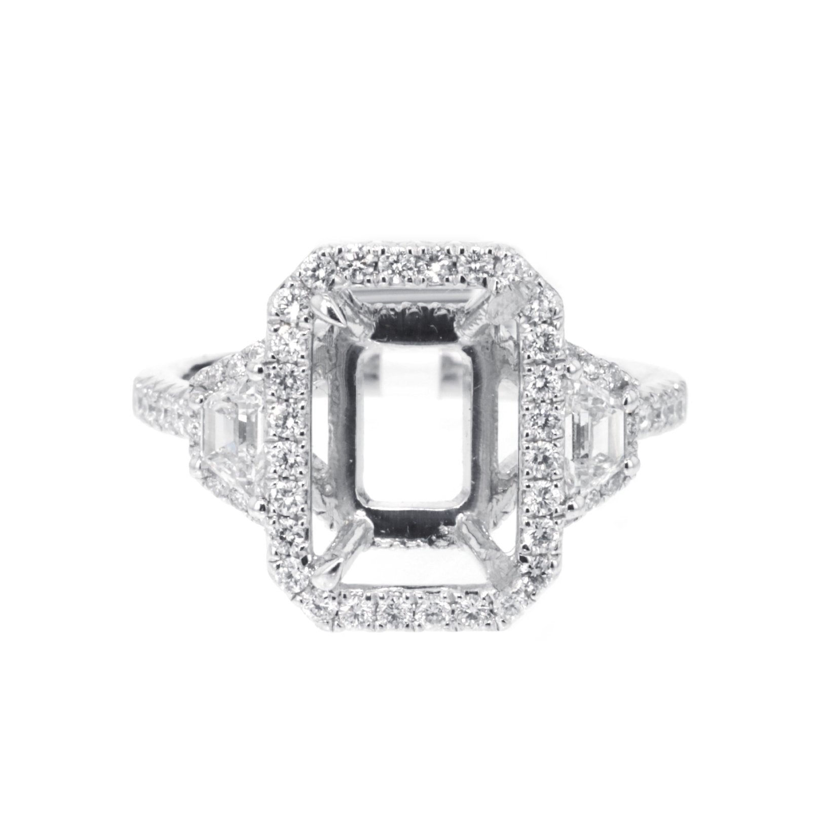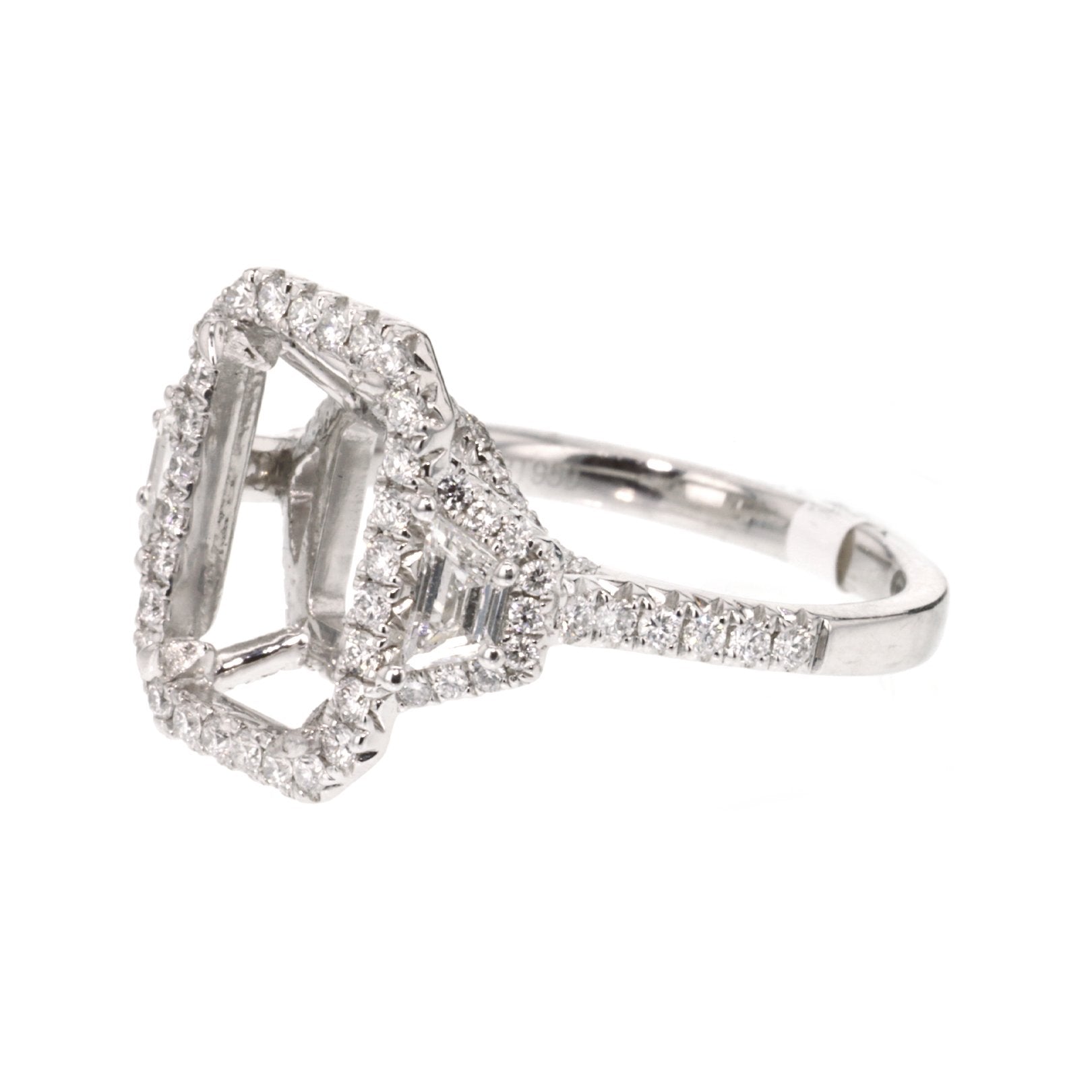Platinum emerald-shape halo semi-mount ring with a four-prong setting for a 4.00 carat emerald-cut center. Features a diamond gallery and diamond crown, accented with 2 trapezoid diamonds totaling 0.33 carats and 104 round diamonds totaling 0.50 carats, all prong set. Diamonds are GH color and SI clarity. Center sold separately. Available by special order in other metals, shapes, and sizes.