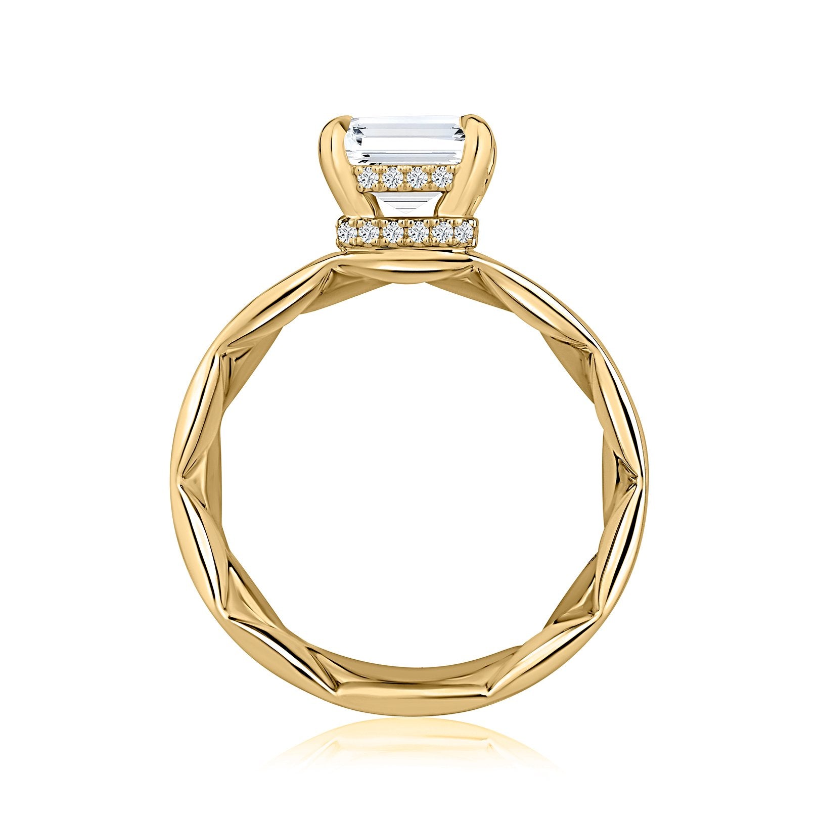 14KT yellow gold quilt solitaire ring designed for a 3.00ct emerald-cut center, featuring a hidden halo and diamond-accented gallery. Set with 48 prong-set round diamonds totaling 0.19 carats, G color and SI clarity. Center sold separately. Available by special order in other metals, shapes, and sizes.