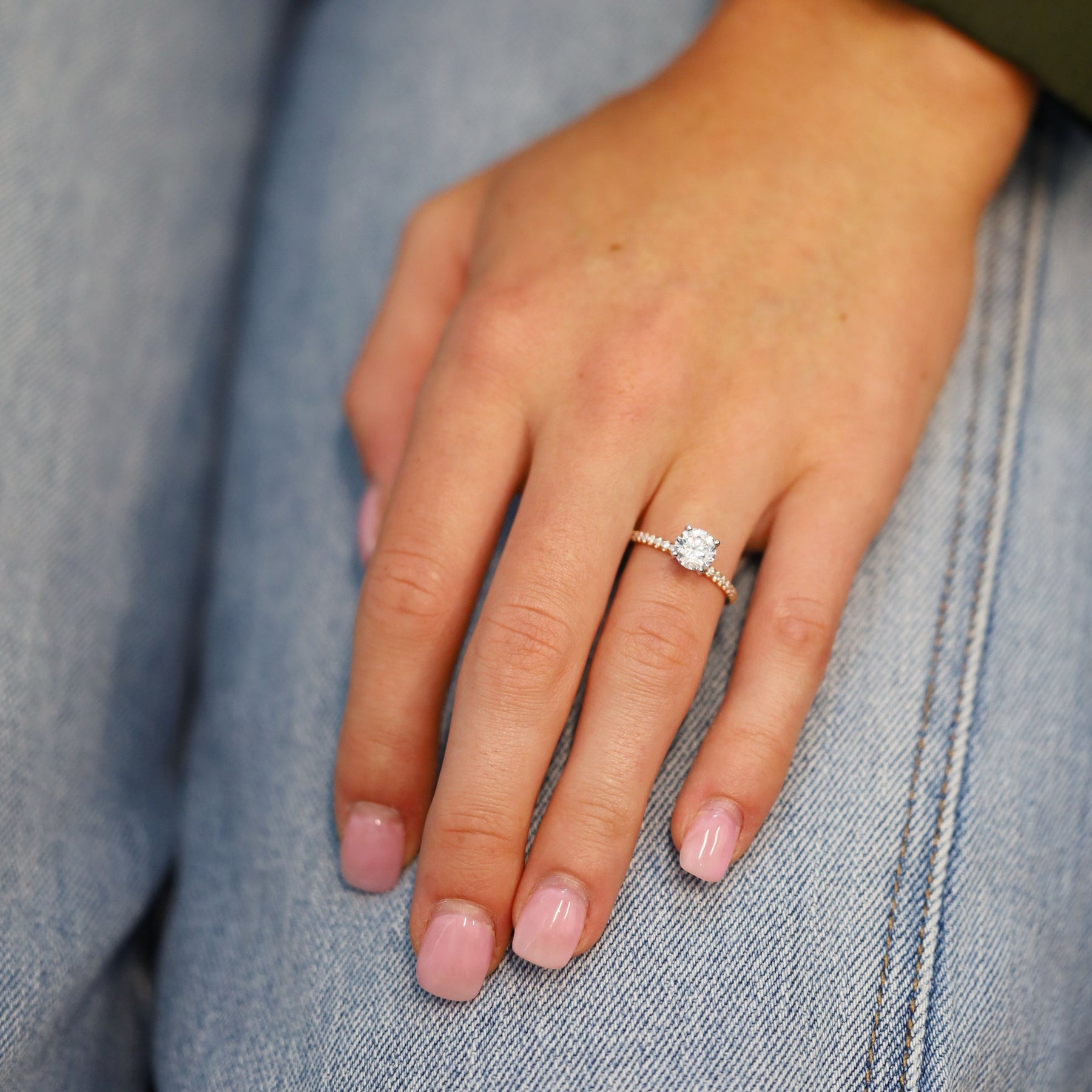 14K white and rose gold 4-prong 3/4 semi-mount ring (1.00 ct round crown size) from The Signature Collection by Continental Diamond featuring 26 shared split prong-set round diamonds totaling 0.23 ctw (FG/VS). Available by special order in other metal colors, metal types, diamond shapes, and sizes. Center sold separately.