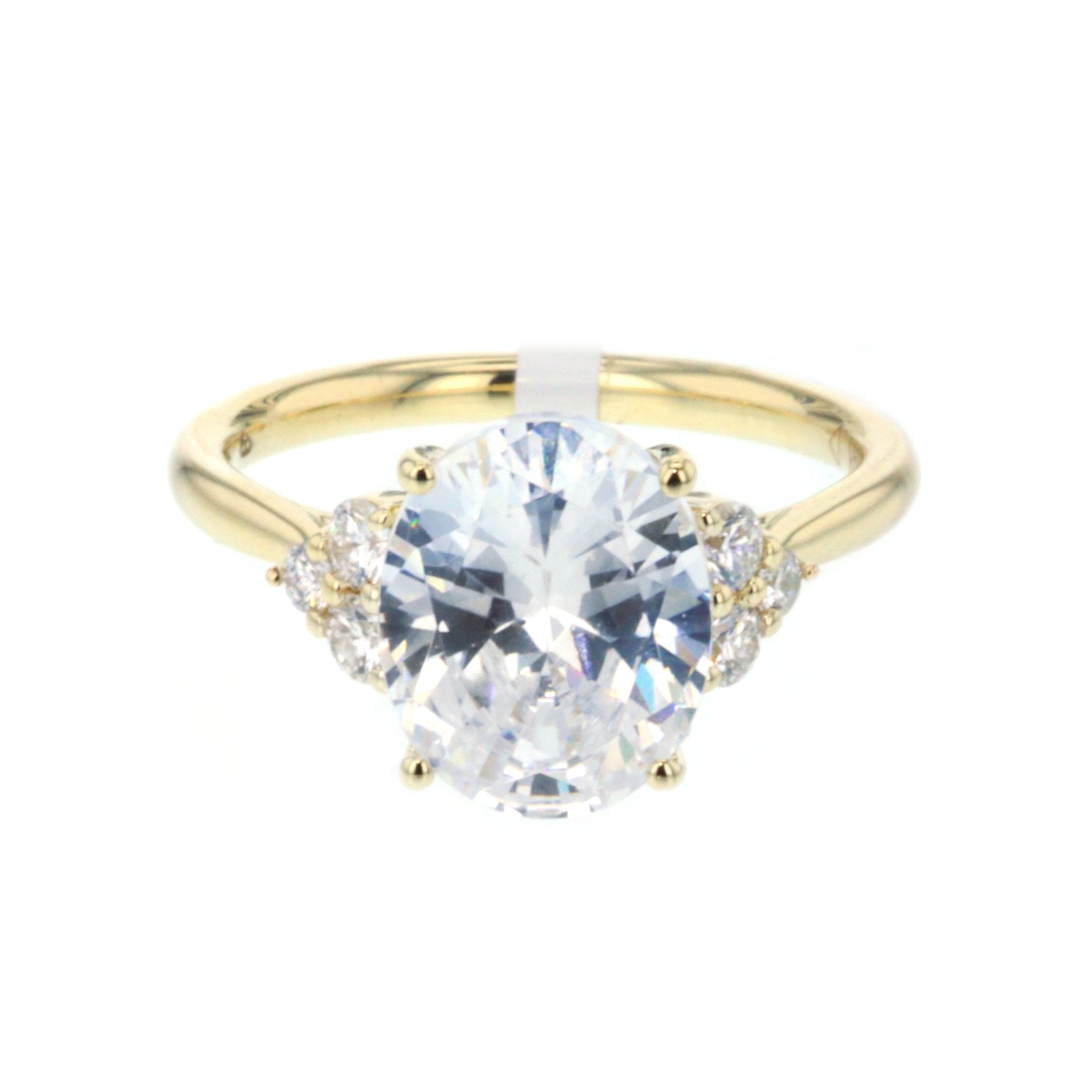 This semi-mount ring is crafted in 14K yellow gold with a four-prong cathedral setting designed to hold a 3.00 carat oval center. The band is accented with 6 round diamonds totaling 0.27 carats in shared prong settings. The diamonds are graded GH color and SI clarity. Center sold separately. Available by special order in other metals, shapes, and sizes.