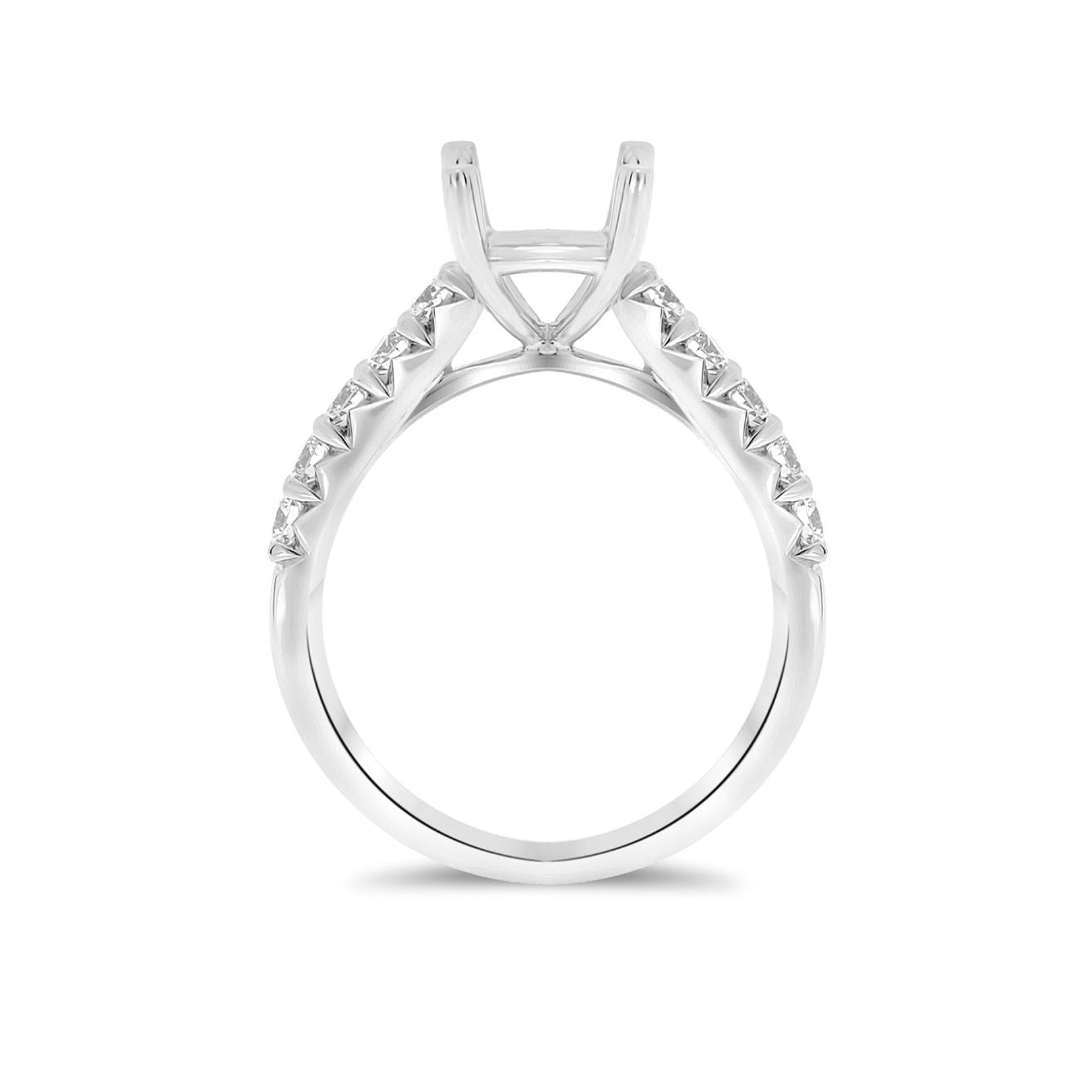 This semi-mount ring is crafted in 14K white gold with a four-prong cathedral setting designed to hold a 2.00 carat oval center. The band is accented with 10 round diamonds, totaling 0.49 carats, in shared prong settings. The accent diamonds are graded GH color and SI clarity. Center sold separately. Available by special order in other metals, shapes, and sizes.