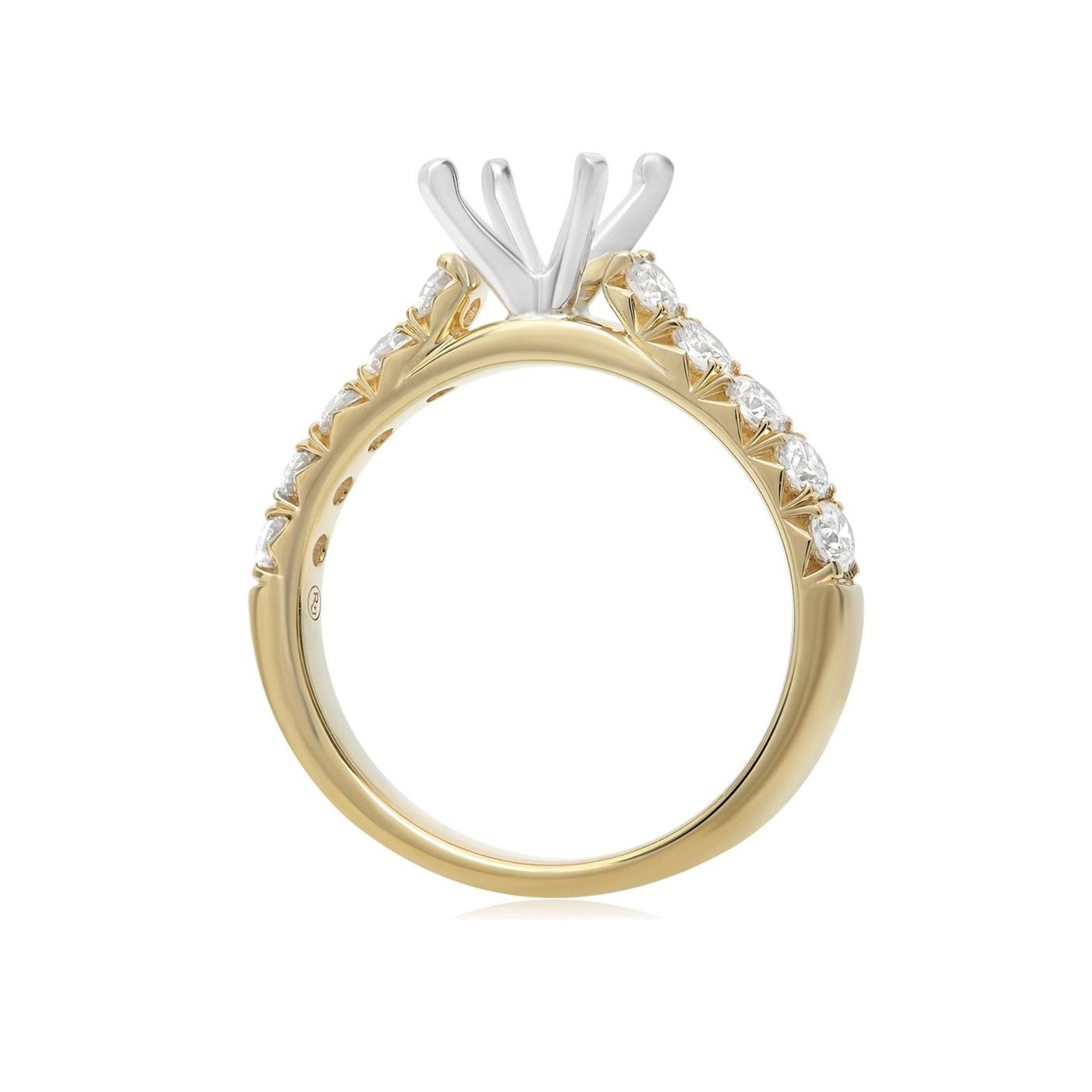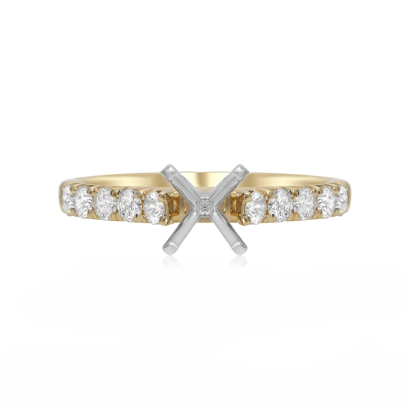 14K yellow and white gold semi-mount ring with a 4-prong head (fits approx. 1.00ct round center, sold separately) and 10 round diamonds totaling 0.65 carats (GH/SI, 4-prong set). Available by special order in other metals, diamond shapes, and sizes.
