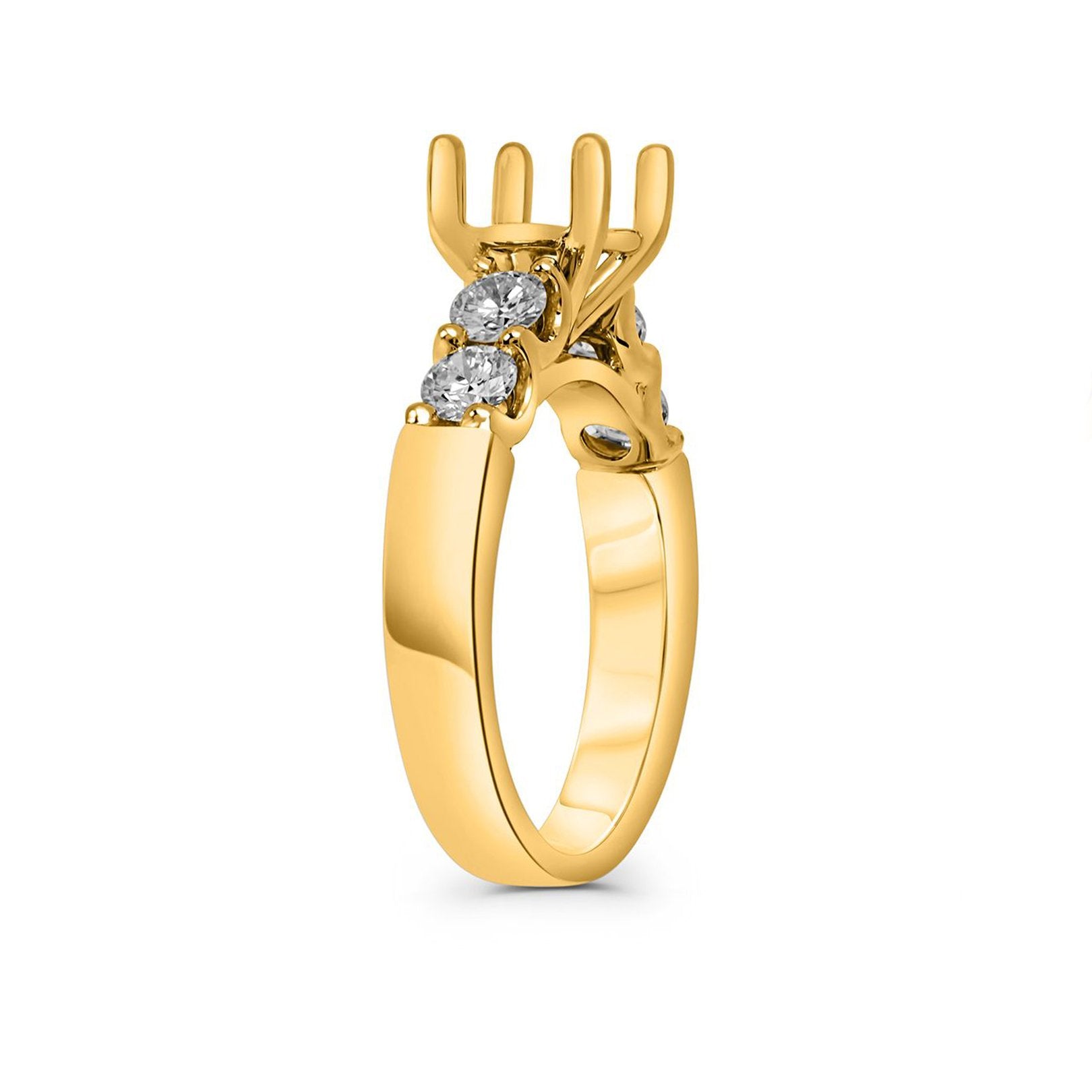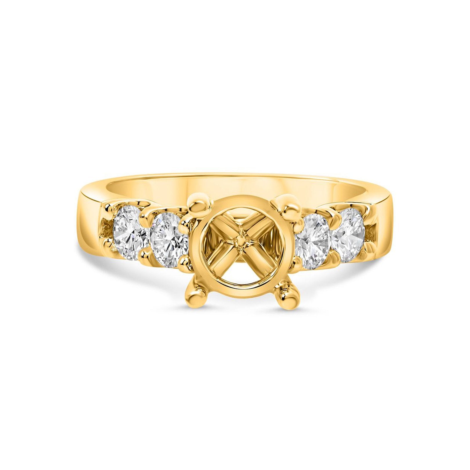 14K yellow gold cathedral semi-mount ring with a 4-prong setting for a 1.50ct round center. Features 4 GH/SI round diamonds totaling 0.80ctw, set in U-shape shared prong settings. Center sold separately. Available by special order in other metals, shapes, and sizes.