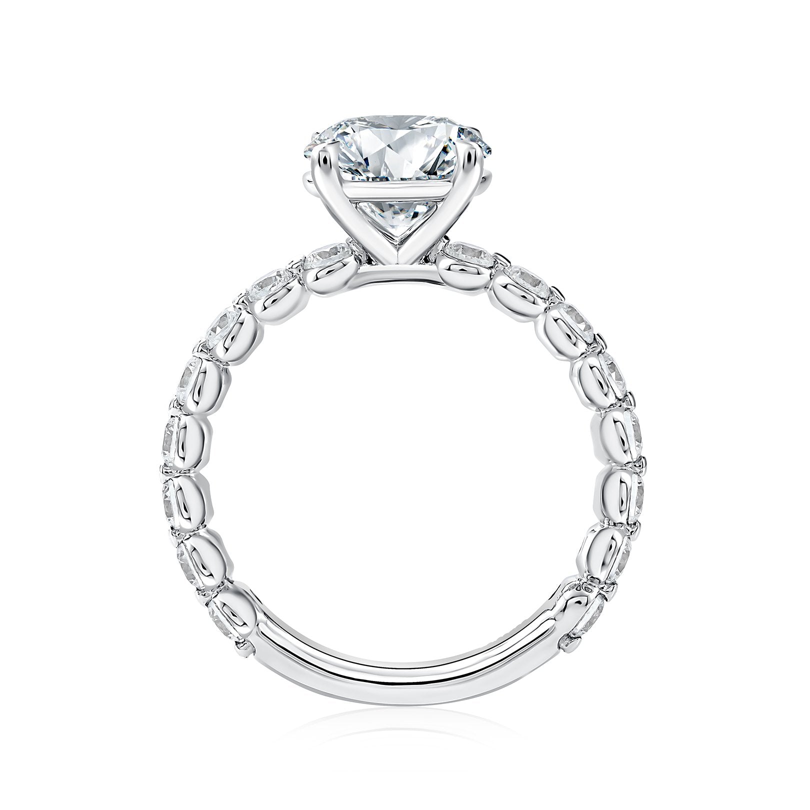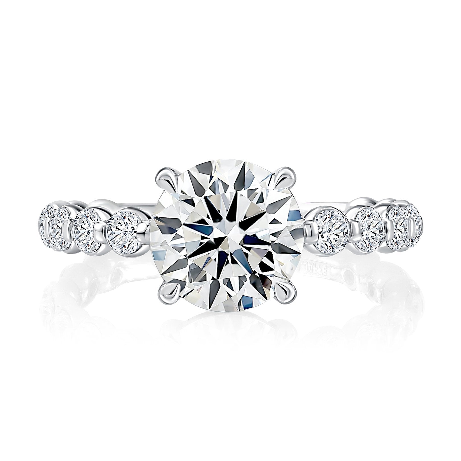 14K white gold 3/4 semi-mount ring designed for a 2.00ct round diamond. Features 16 shared single prong-set round diamonds totaling 0.80ctw, G/SI quality. Center sold separately. Available by special order in other metals, shapes, and sizes.