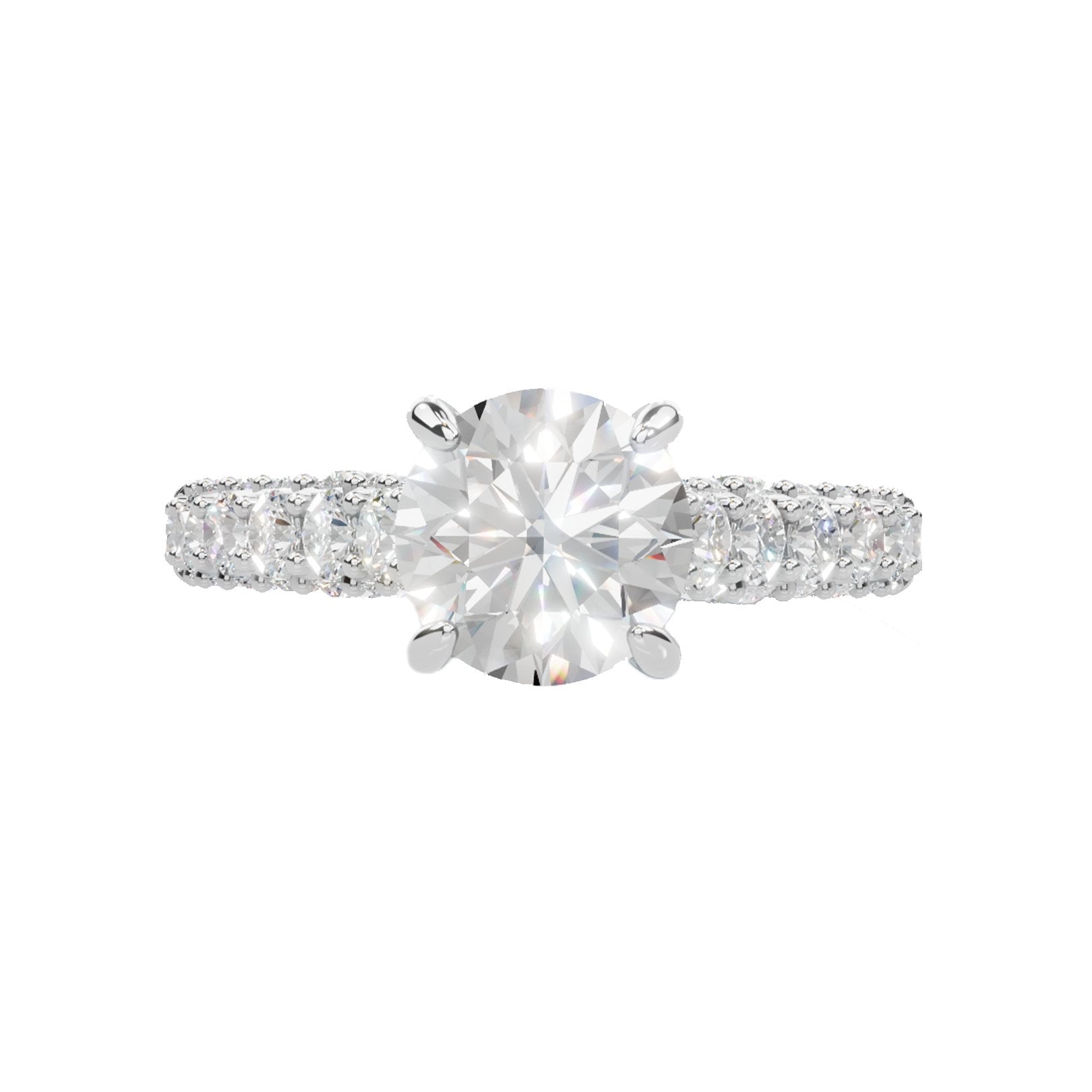 14K white gold side view semi-mount ring with a four-prong setting designed for a 1.00 carat round center (crown size). Accented with 58 shared prong set round diamonds totaling 1.37 carats. Diamonds are GH color and VS clarity. Part of the Signature Collection by Continental Diamond. Center sold separately. Available by special order in other metals, shapes, and sizes.
