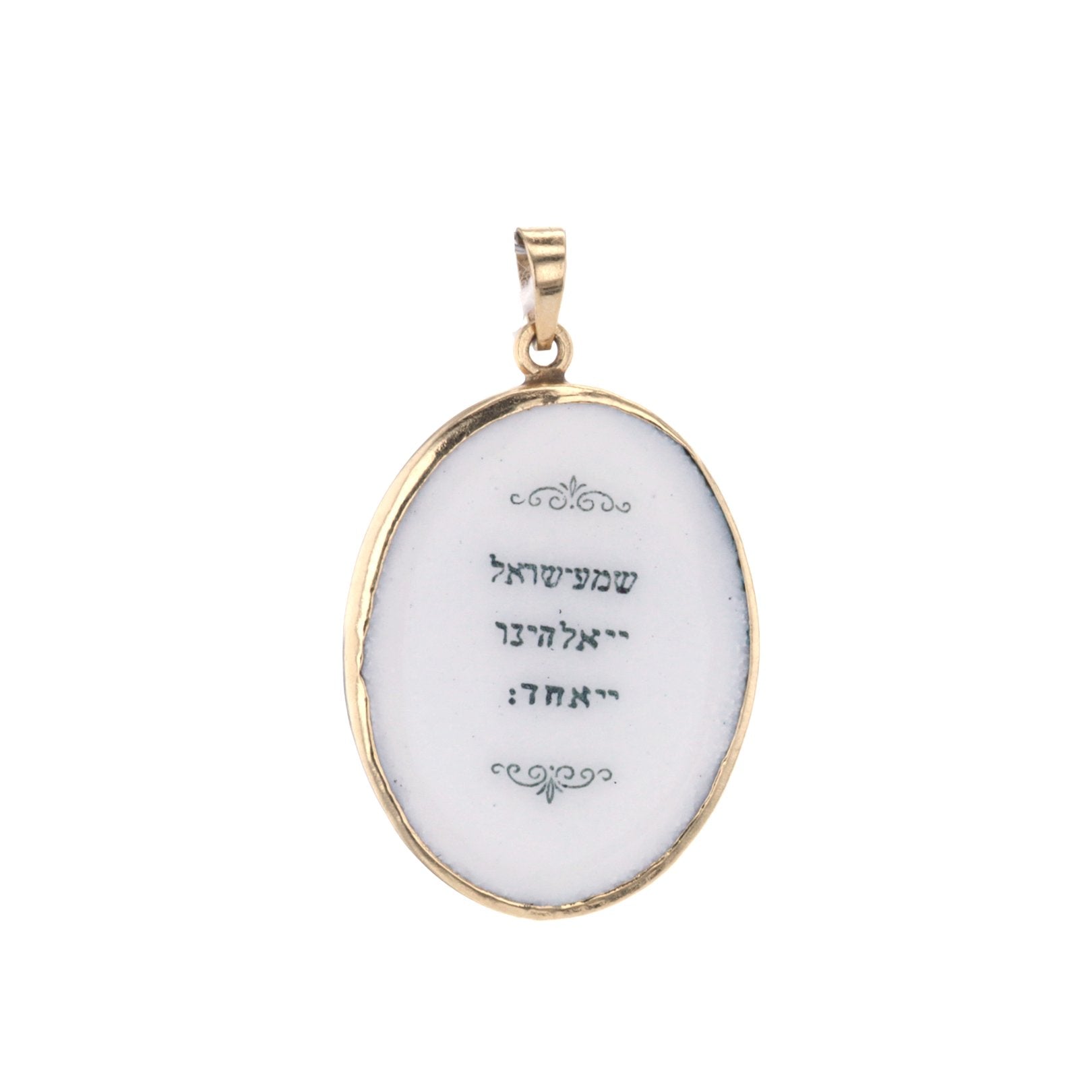 Estate yellow gold and enamel charm depicting Moses and the Ten Commandments, with Hebrew inscription on the reverse: "Hear, O Israel, the Lord our God is One."