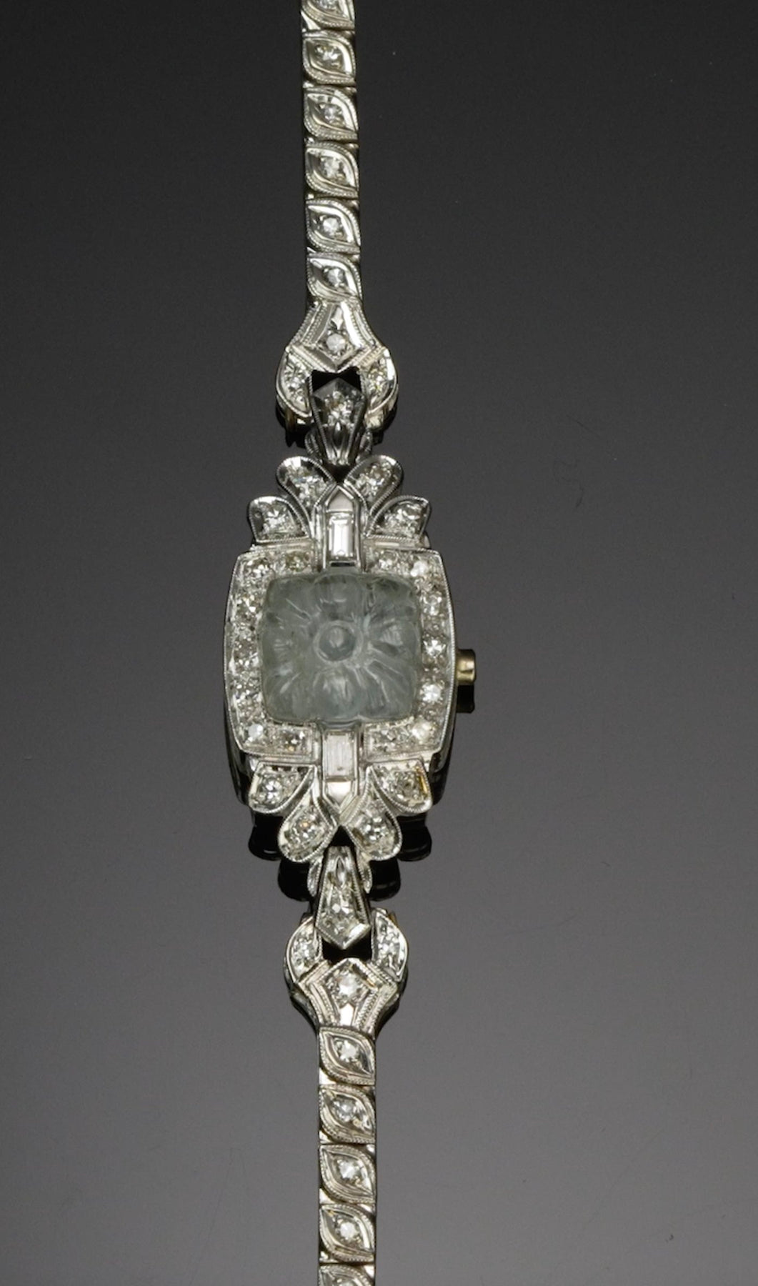 Estate platinum watch case and bracelet set with 42 round diamonds and two baguette diamonds, featuring a carved aquamarine replacing the original movement and crystal.