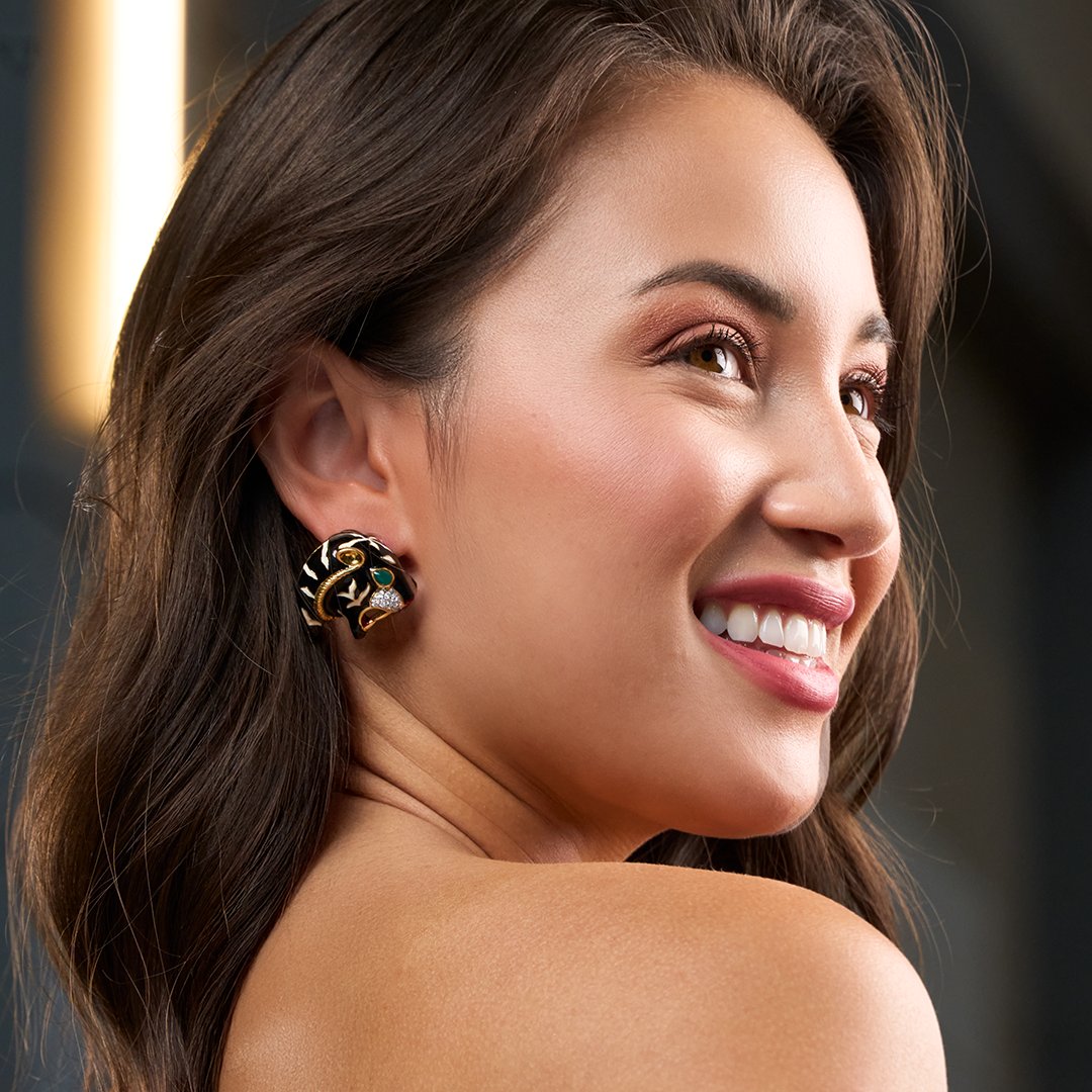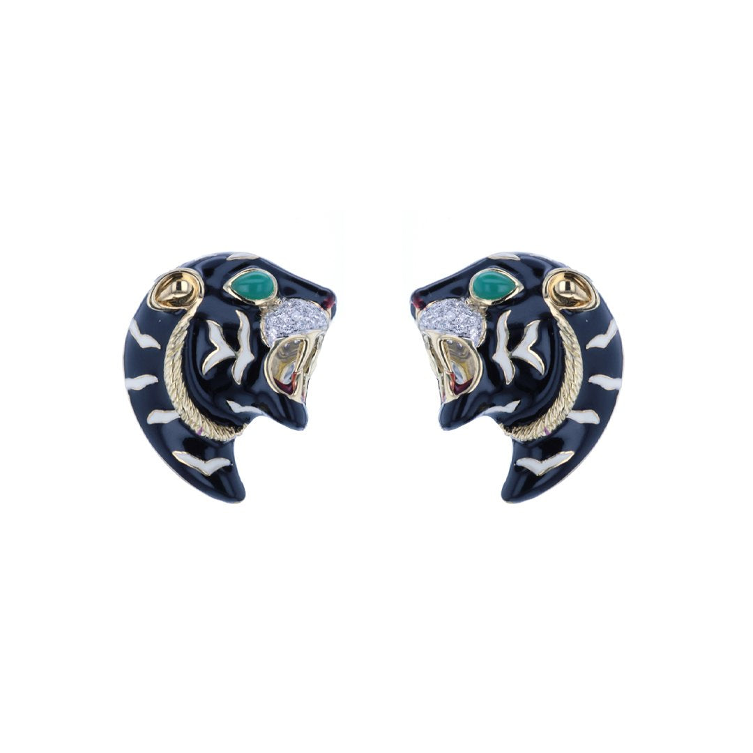 These estate 18KT yellow gold Panther earrings by Robert Legnazzi, dating from the 1980s to early 1990s, feature striking black, white, and red enamel detailing with vibrant green cabochon gem eyes. Accented by 32 pavé-set round diamonds and finished with 14KT yellow gold findings, these unique earrings combine bold artistry with luxurious craftsmanship.