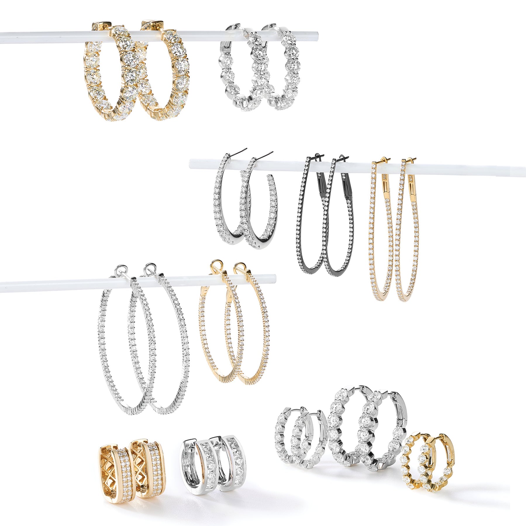 These 1.50" pear-shaped inside-out hoop earrings in 18K white gold with black rhodium feature 106 four-prong–set round diamonds totaling 0.70ctw (GH/SI2).