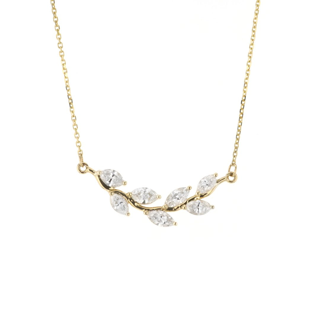 Custom created by Continental Diamond, this 14KT yellow gold 18" arched vine bar necklace features a graceful, nature-inspired design adorned with 7 marquise diamonds totaling 1.35CTW (E-I color, VS2-SI1 clarity) in elegant 2-prong settings.