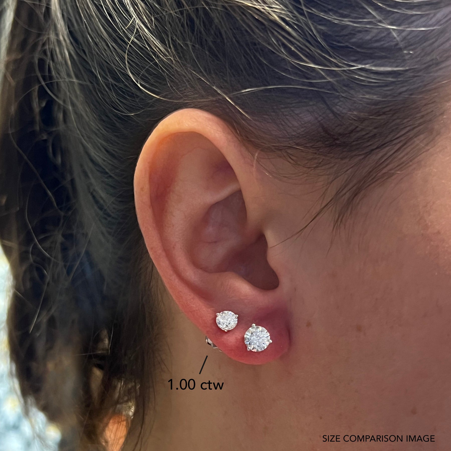 These 14K white gold three-prong martini stud earrings feature two round diamonds totaling 1.61ctw (HI/VS2). Please note that the images shown are for reference purposes only and do not show the actual earrings. Actual sizes may vary.