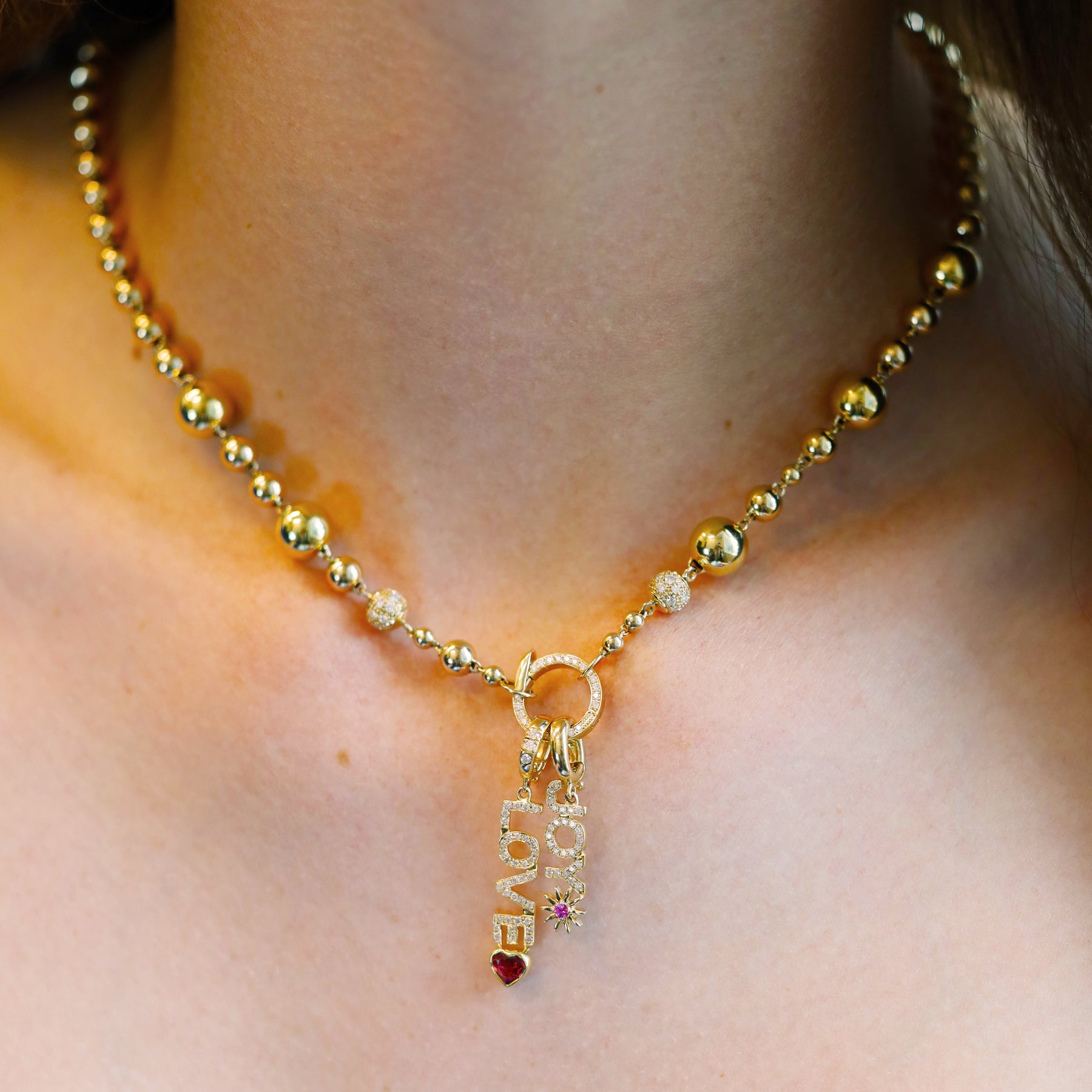 14kt yellow gold “Love” pendant featuring 0.18ctw prong-set round diamonds (G/VS) and one bezel-set heart-shaped pink sapphire weighing 0.41ct. Center sold separately. Available by special order in other metals, shapes, and sizes.