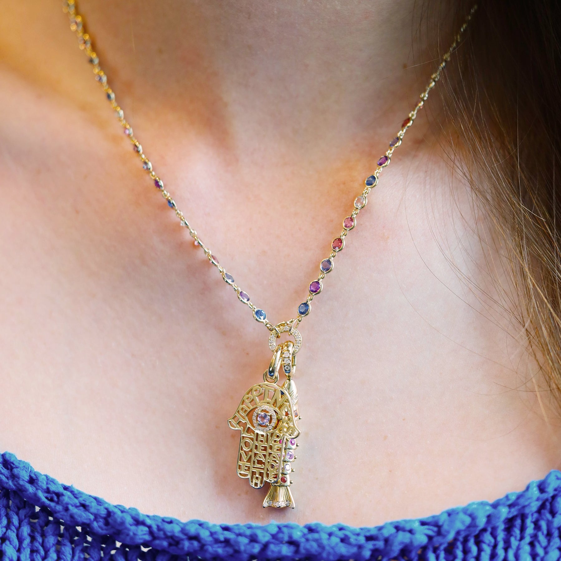 14K yellow gold 22" bezel-set mixed pastel sapphire necklace with pavé-set round diamonds totaling 0.05ctw, G/VS quality. Pendants sold separately