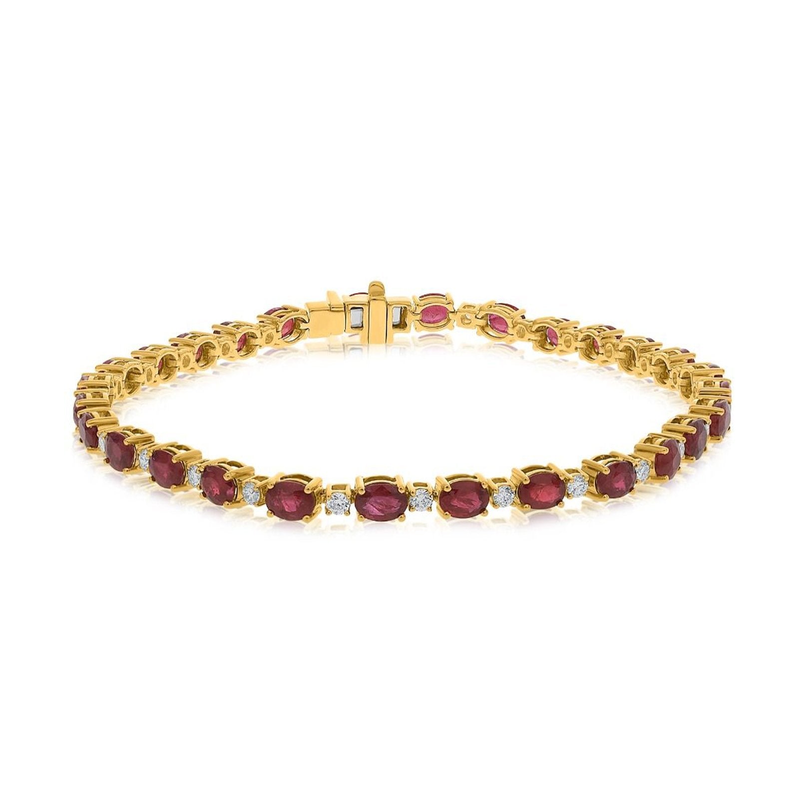 14K yellow gold 7" bracelet featuring 28 four-prong-set oval rubies totaling approximately 7.10 ctw and 28 four-prong-set round diamonds totaling approximately 0.75 ctw, GH color, SI clarity.