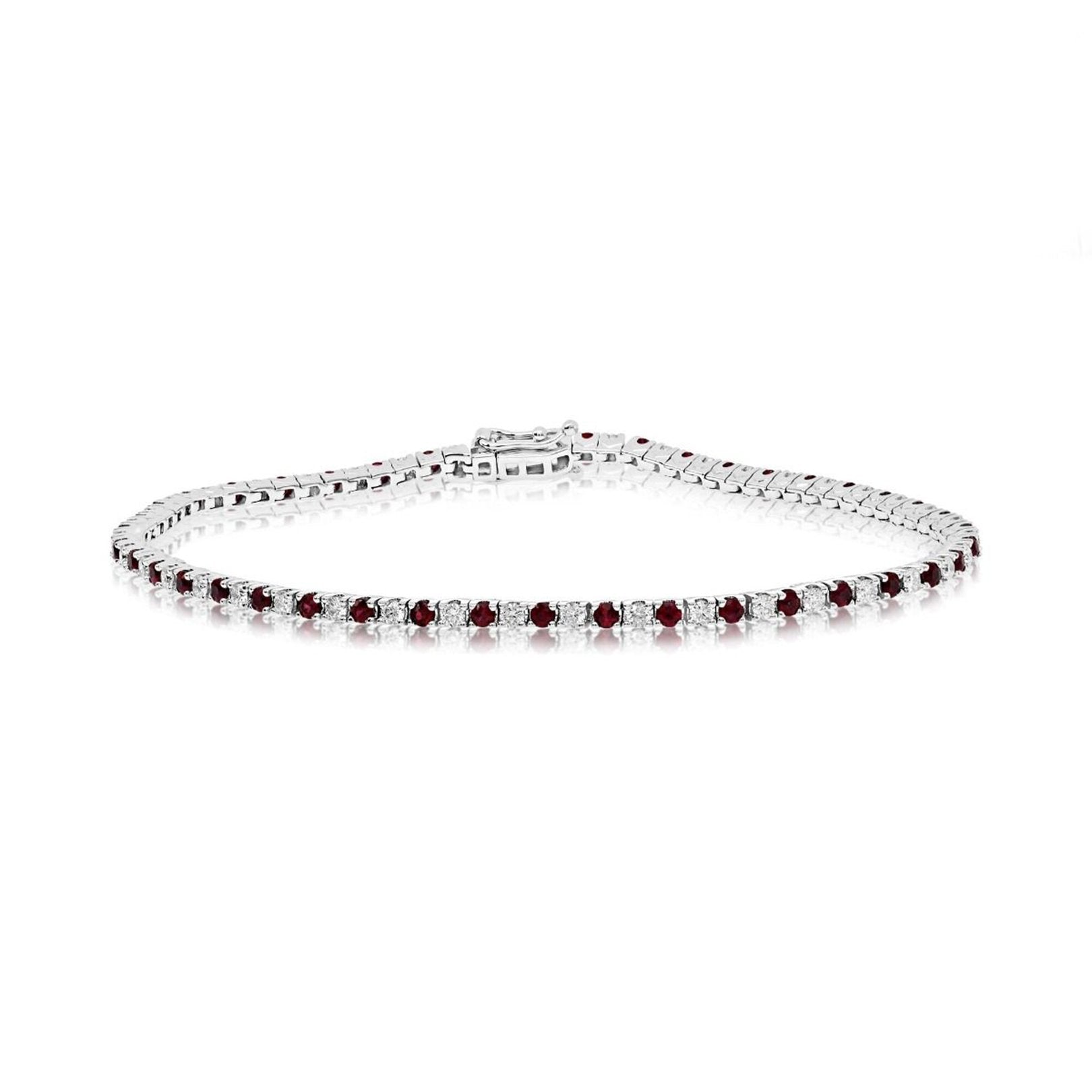 14K white gold bracelet featuring 42 round GH/SI diamonds totaling 1.00ctw and 42 round rubies totaling 1.25ctw, all set in 4-prong settings.