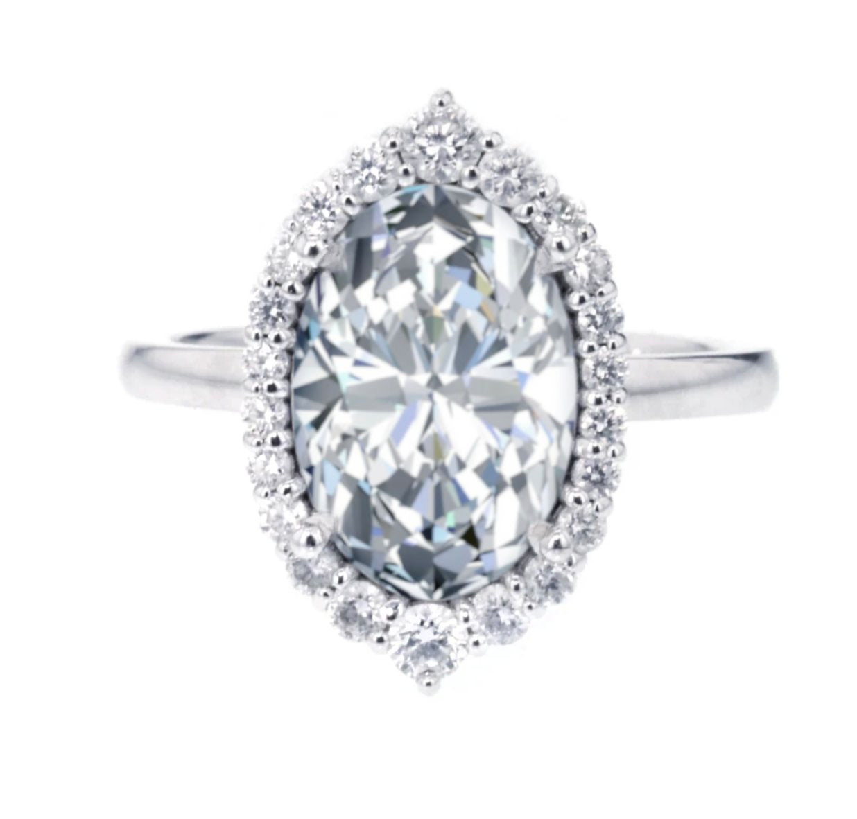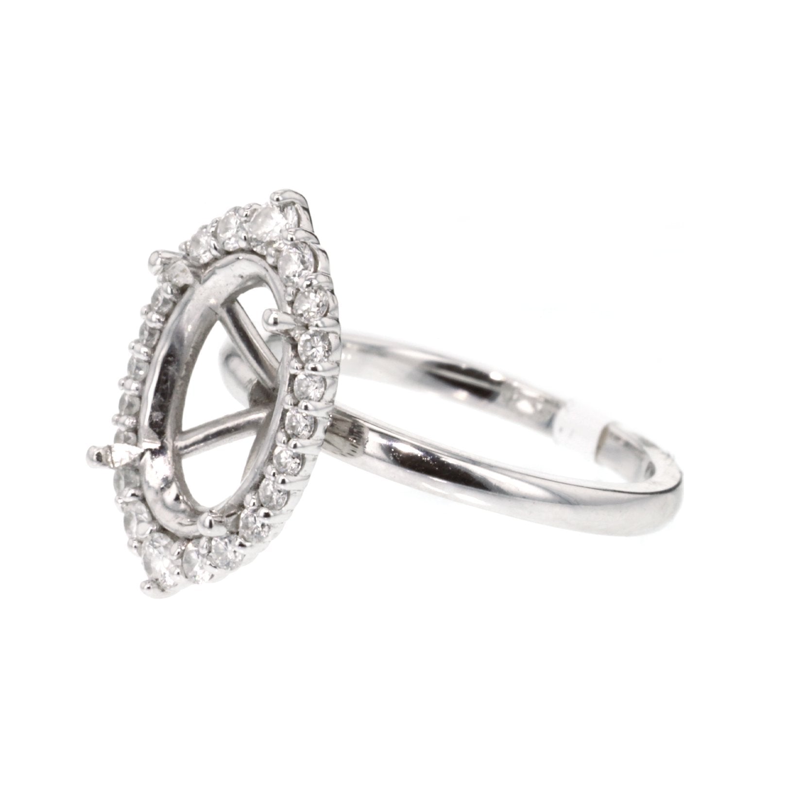 14K white gold oval halo semi-mount ring with a four-prong setting for a 2.50 carat oval center. Accented with 22 round diamonds totaling 0.33 carats, shared prong set, GH color and SI clarity. Center sold separately. Available by special order in other metals, shapes, and sizes.