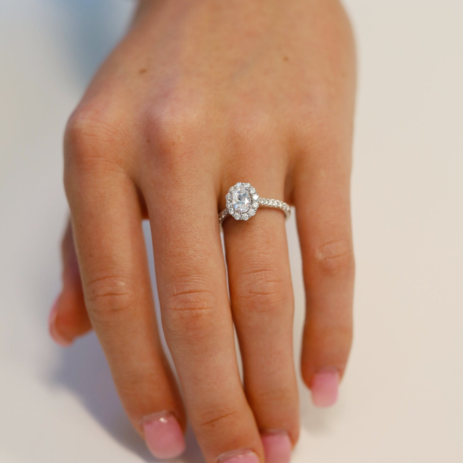 14K white gold Diamond Gallery cathedral semi-mount ring with an oval halo design, featuring a 4-prong head (fits approx. 1.00ct oval center, sold separately) and 42 prong-set round diamonds totaling 0.56 carats (GH/SI). Available by special order in other metals, diamond shapes, and sizes.