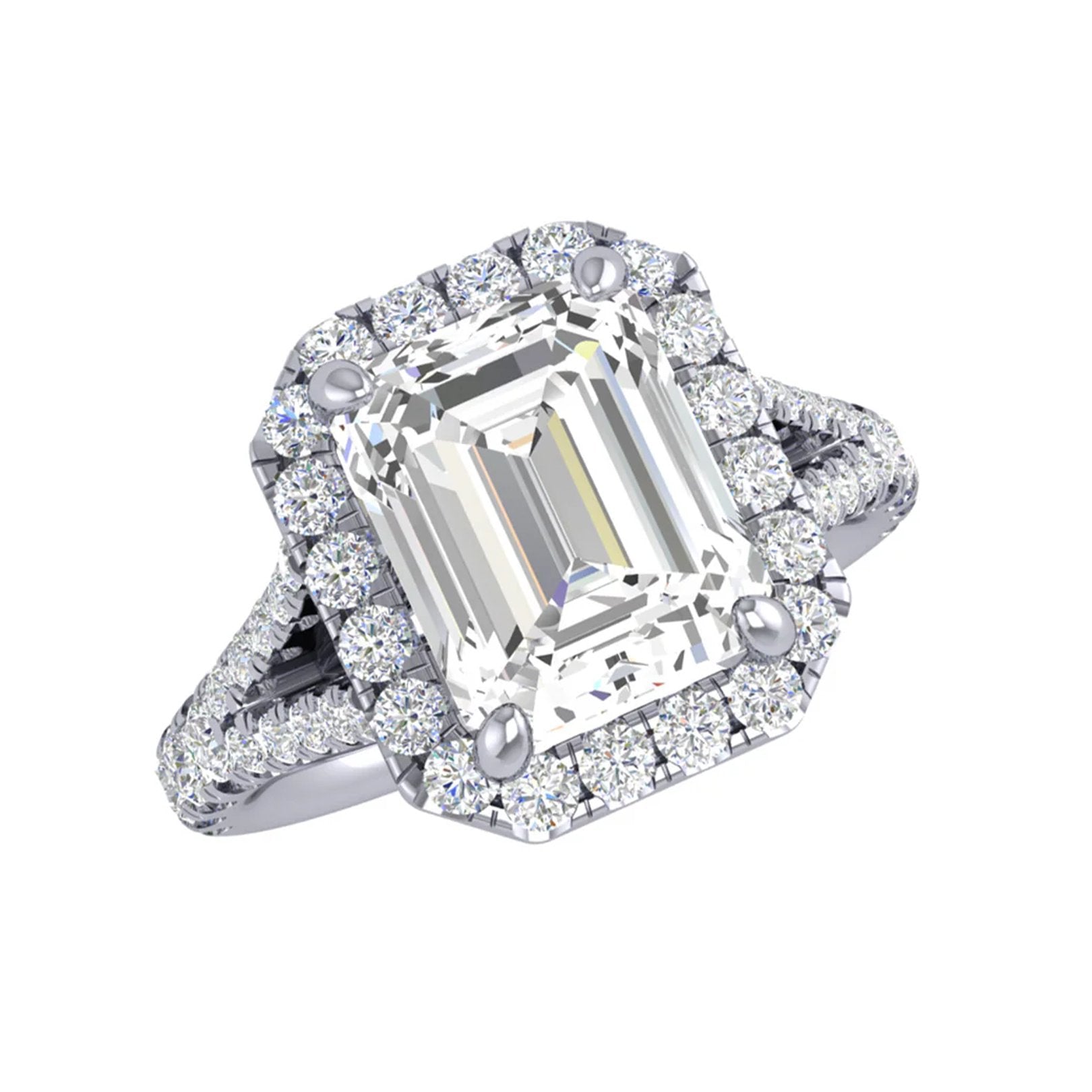 14K white gold split shank semi-mount ring with an emerald-cut halo and a four-prong setting designed for a 3.50 carat emerald-cut center (crown size). Accented with 48 round diamonds totaling 1.07 carats, all four-prong set. Diamonds are GH color and VS clarity. Part of the Signature Collection by Continental Diamond. Center sold separately. Available by special order in other metals, shapes, and sizes.