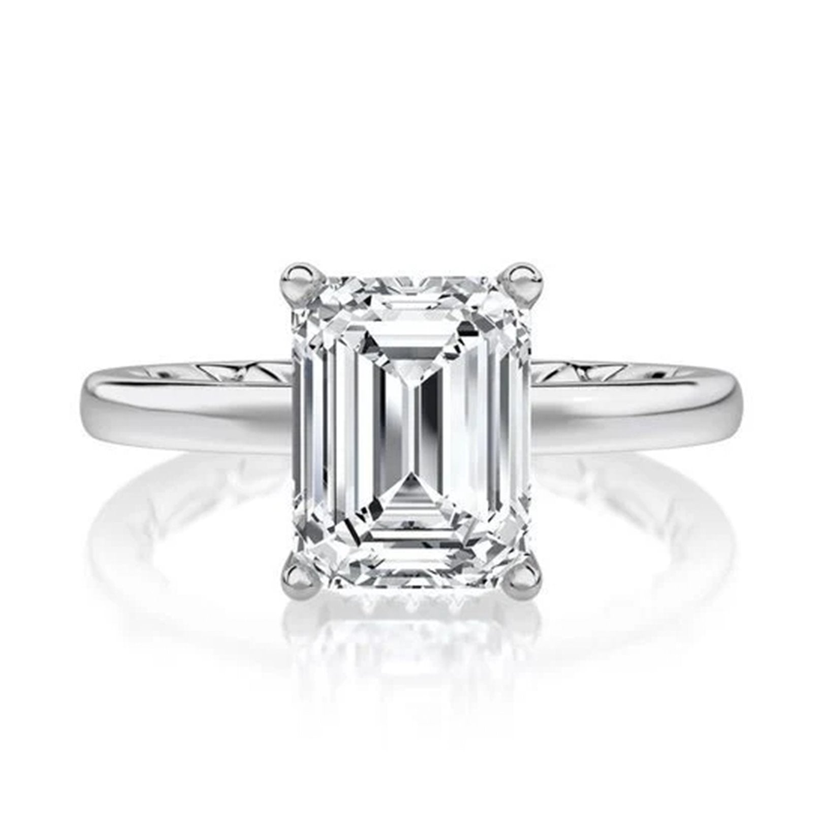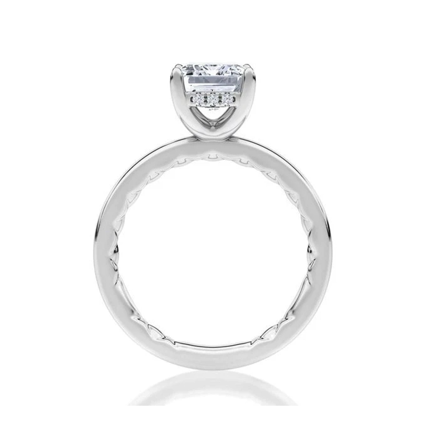 18KT white gold quilt solitaire ring crafted for a 2.00CT emerald-cut center. Features a hidden halo and 14 prong-set round diamonds totaling 0.07CTW (GH/VS), adding subtle sparkle and elegance. Center sold separately. Available by special order in other metals, shapes, and sizes.