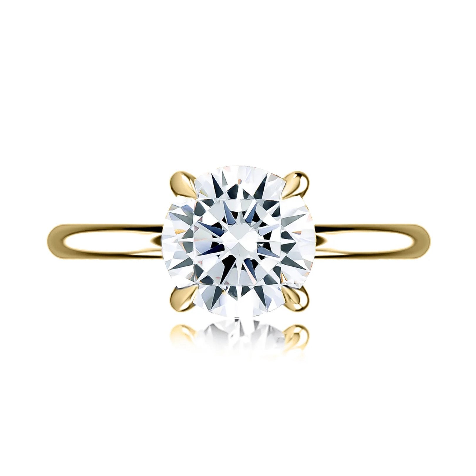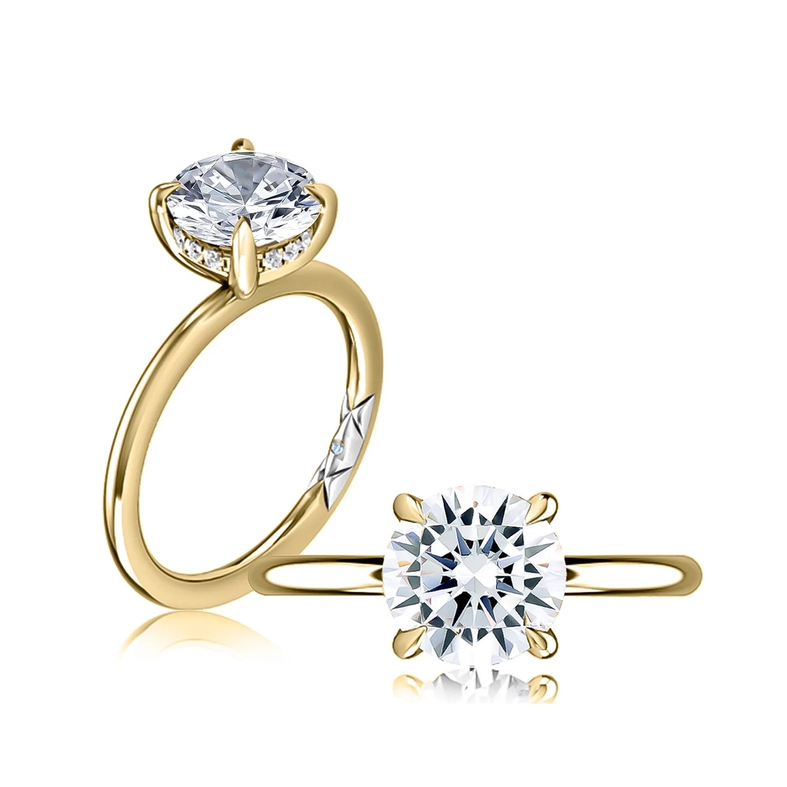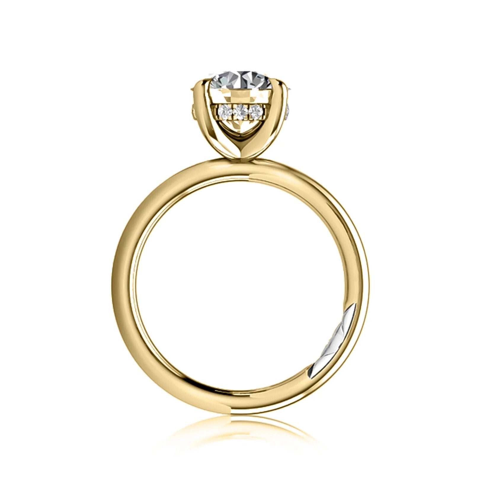 14K yellow gold semi-mount ring with a hidden halo and 4-prong head sized for a 1.50 ct round center. Features quilt-style detailing and 13 round G/SI diamonds (0.07 ctw) set in prong and flush settings. Center not included.Available by special order in other metals, shapes, and sizes.