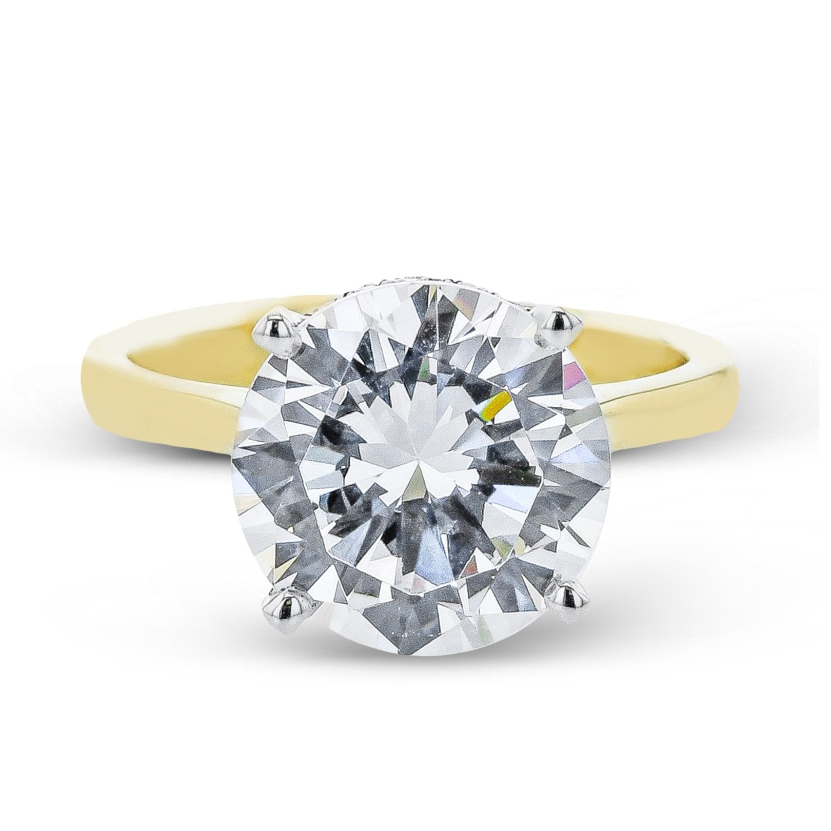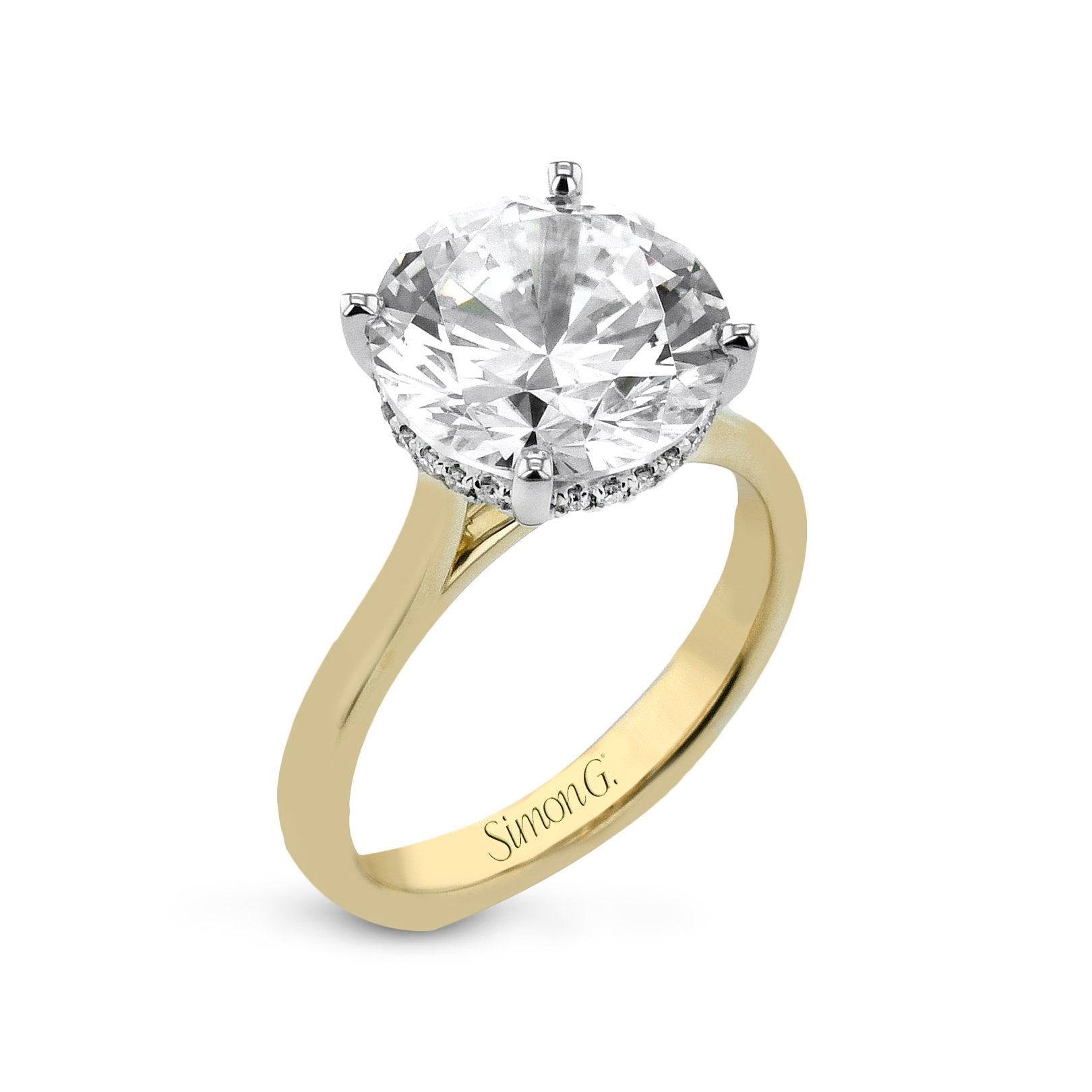 4-prong hidden halo solitaire ring (5.00 ct round crown size) featuring 24 four-prong-set round diamonds totaling 0.08 ctw. In-store ring is a sample. Available by special order only. Other metal colors, types, diamond shapes, and sizes are also available by special order. Center sold separately.